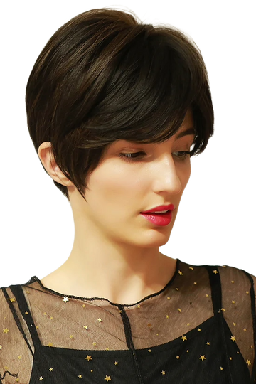 Peruca saten inchis tunsa scurt cu perciuni si breton Produs masurat si verificat - tip...