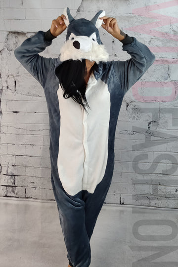Pijama tip salopeta cu maneci lungi material flausat LUP gluga cu urechi inchidere cu nasturi...