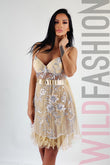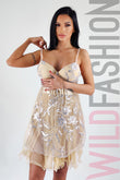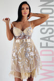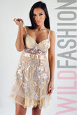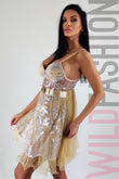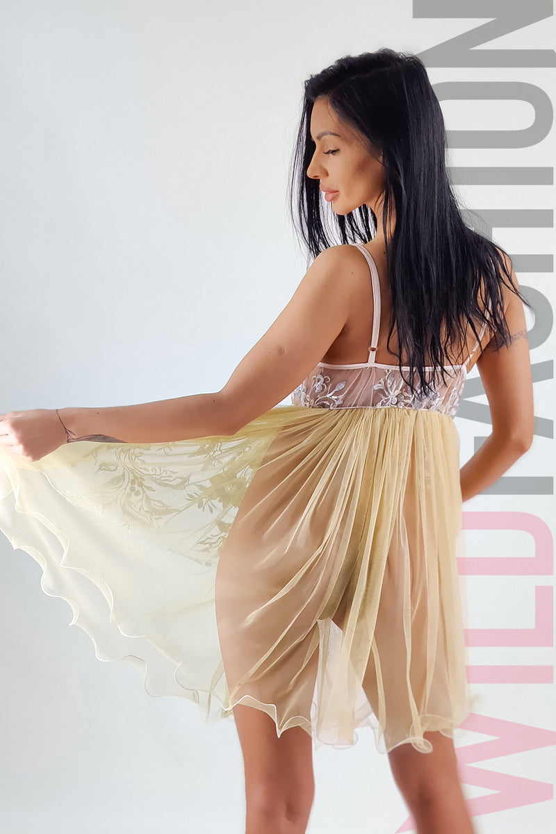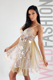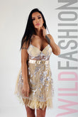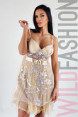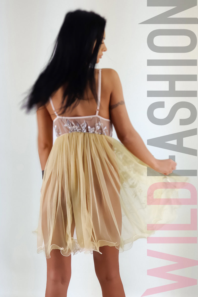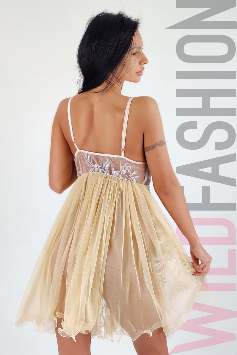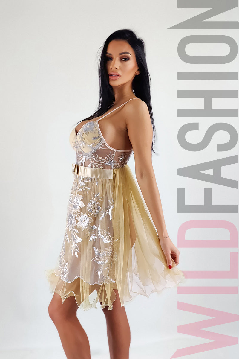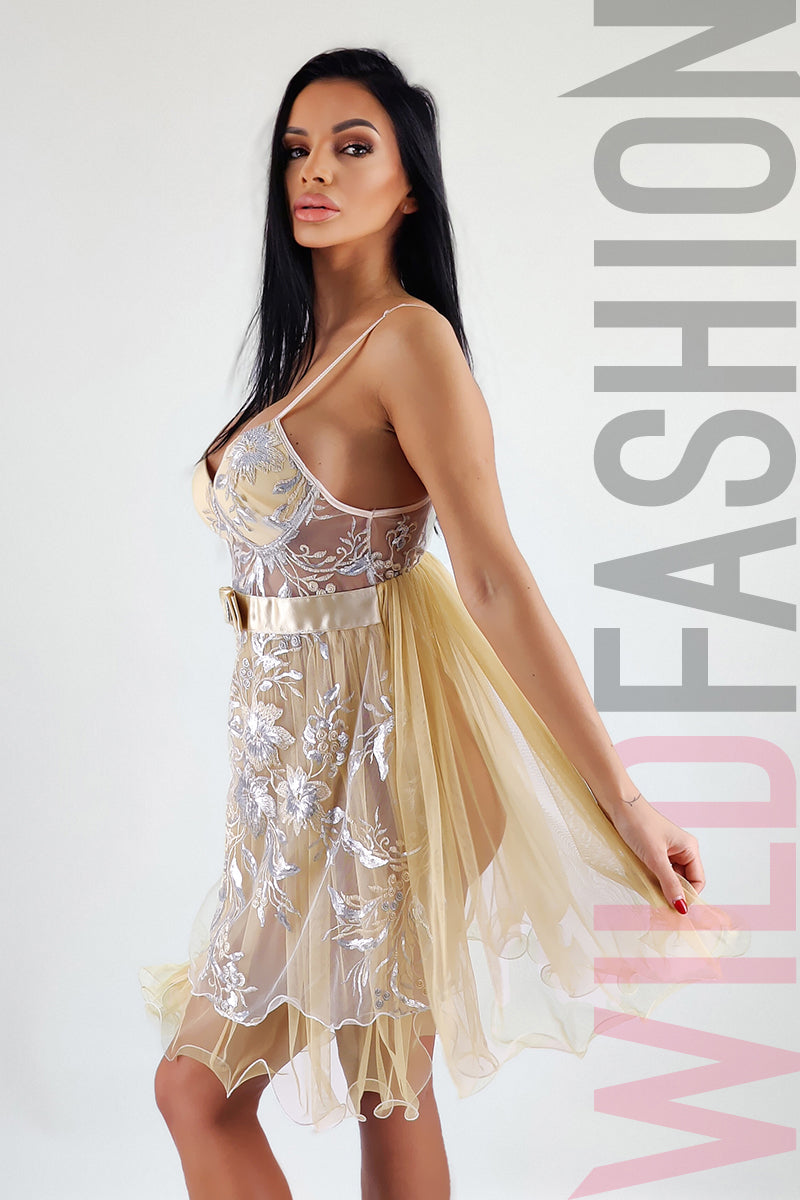 Desu elegant de lux din plasa fina cu volanase in partea din fata are un material suprapus din plasa cu broderi florala accesorizat cu paiete argintii banda lata satinata sub bust cu fundita si brosa cu strasuri cupe cu burete si push-up bretele subtiri reglabile peste umeri doua benzi subtiri elastice la spate si brosa detasabila intre cupe