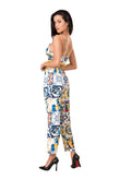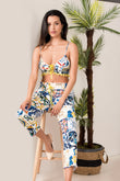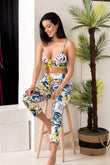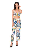 Lenjerie casual tip pijama din top tip sutien accesorizat cu ciucurei si pantaloni lungi din material satinat si print colorat ideal pentru noptile fierbinti