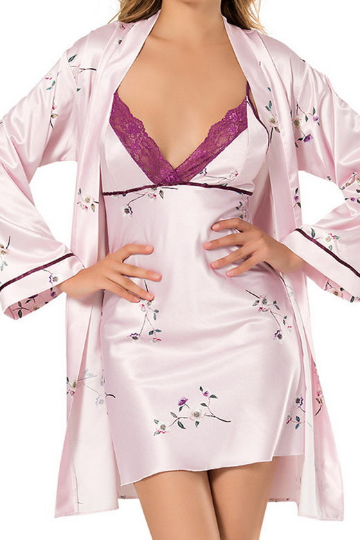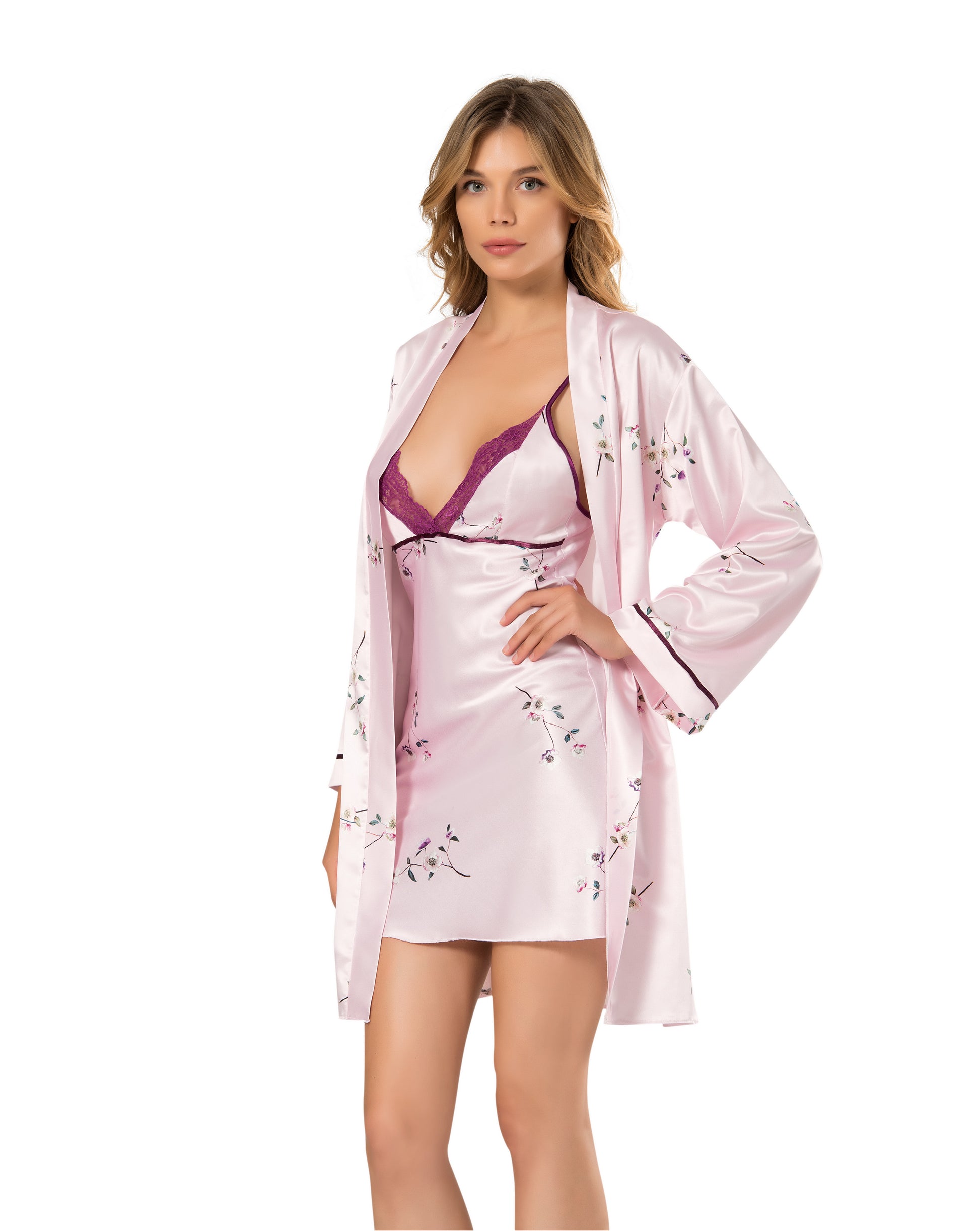 Set 2 piese lenjerie casual din desu si halat cu material satinat cu print floral L835-5