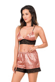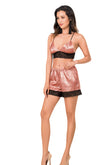 Compleu casual din top tip sutien si pantaloni scurti tin material satinat cu dantela