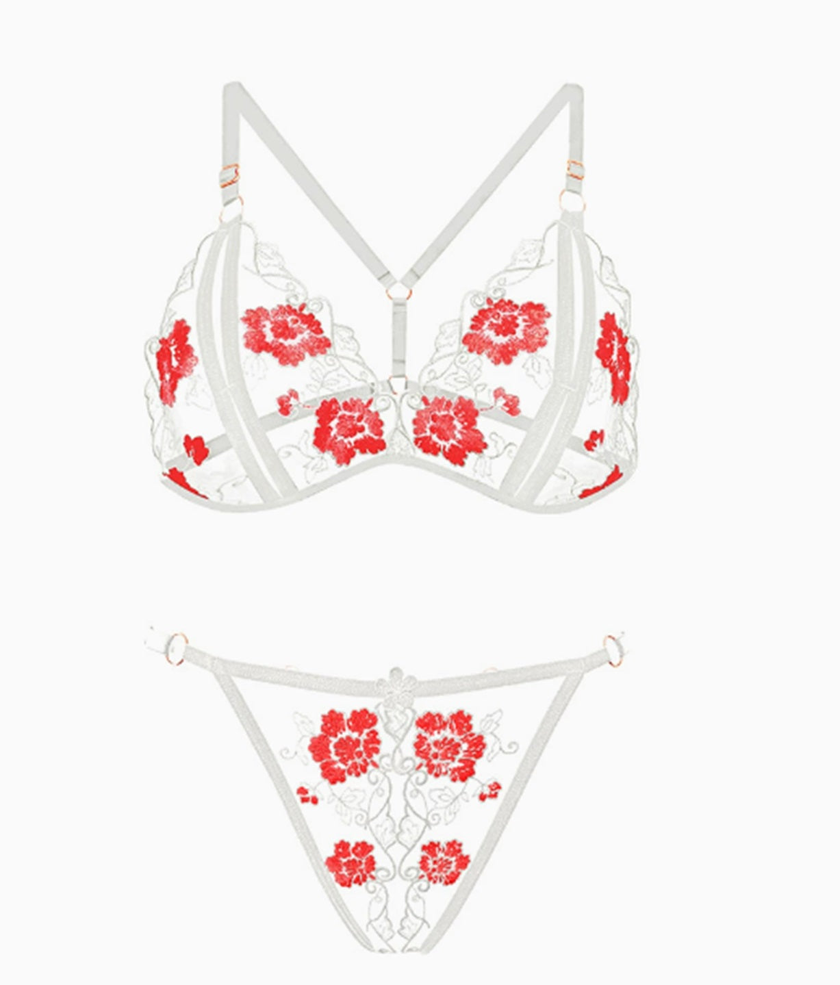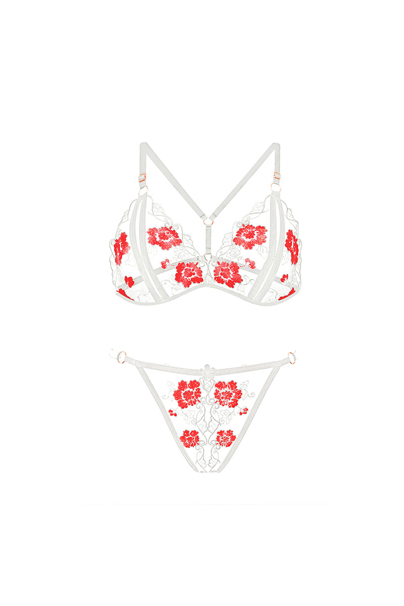 Set 2 piese lenjerie kinky din sutien si chilot cu decupaje si broderie, Alb si Rosu - Descriere si Caracteristici