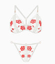 • Realizat din plasa fina, transparenta, in nuanta alb intens, setul este decorat cu broderie florala delicata cu tonuri rosii, creand un contrast vizual spectaculos si sofisticat.