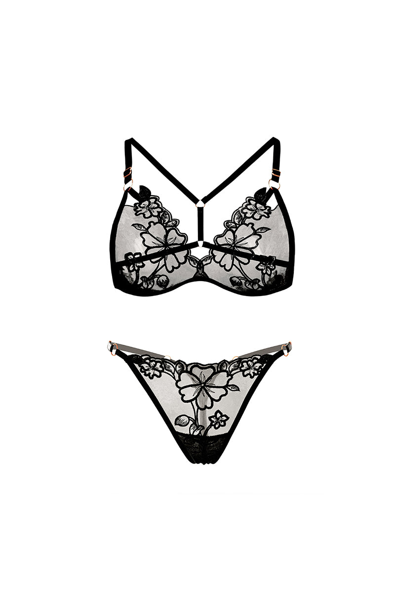 Set 2 piese lenjerie sexy din plasa fina si broderie florala, Negru - Descriere si Caracteristici