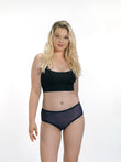 Chilot clasic elastic din plasa fina semitransparenta in fata si dantela florala la spate accesorizata cu decupaje si strasuri snur elastic in talie si captusit inghinal