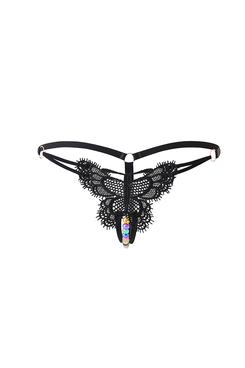 Acest chilot tanga sexy imbina rafinamentul dantelei cu indrazneala accesoriilor glam. Fluturele brodat confera un aer elegant, iar margelele colorate adauga un detaliu playful si seducator. Este alegerea perfecta pentru femeile care vor sa surprinda printr-un look provocator si sofisticat.