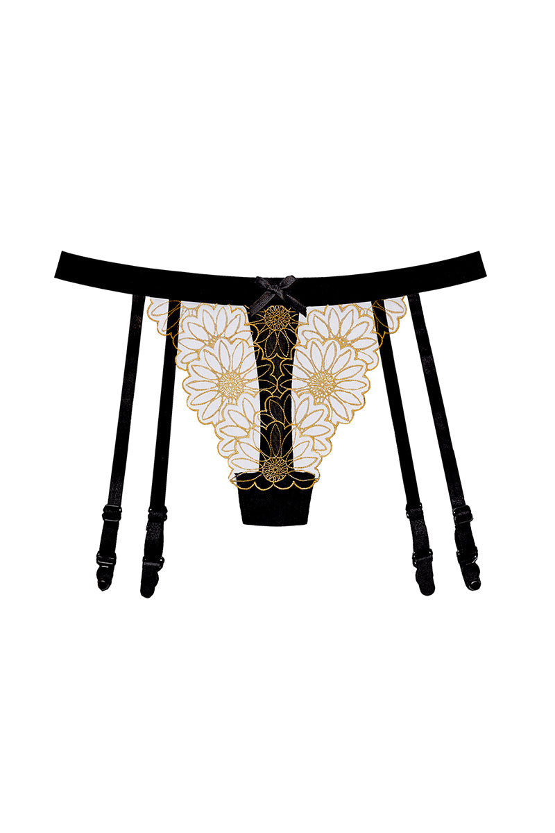 Chilot tanga sexy din plasă cu broderie aurie și jartiere atașate, Negru