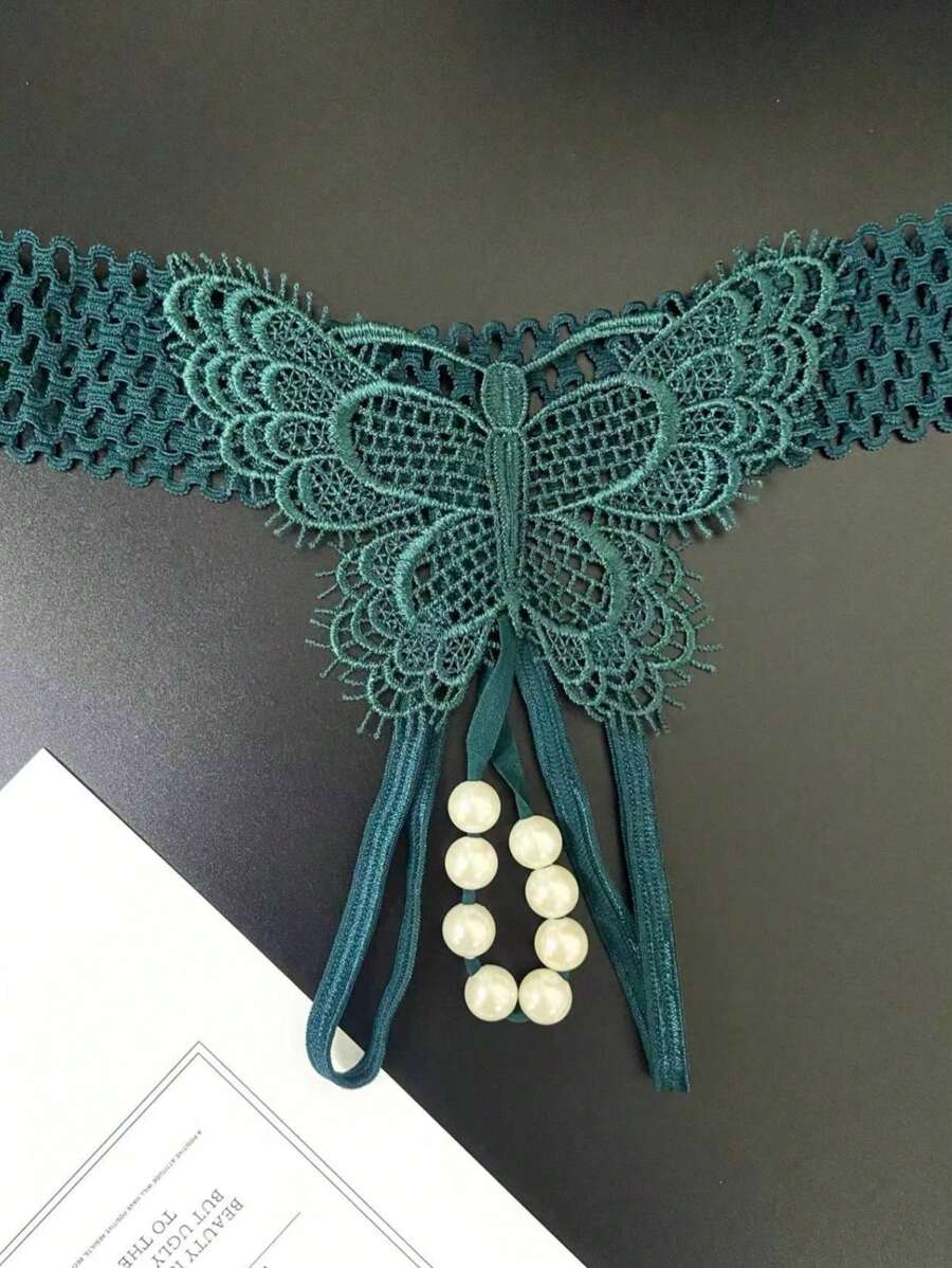 Chiloti snur tanga verde cu sirag de perle si dantela fluture – lenjerie intima sexy pentru femei