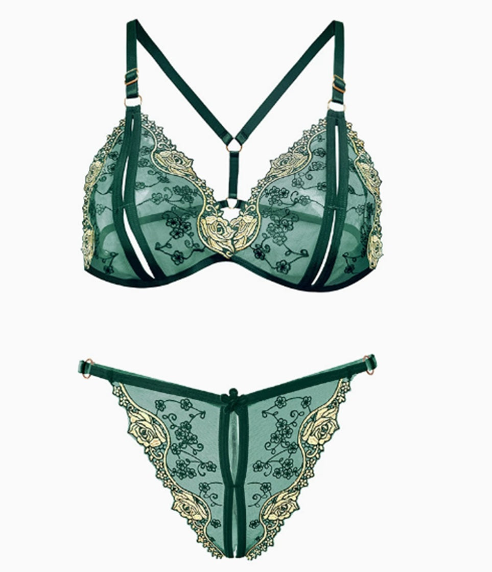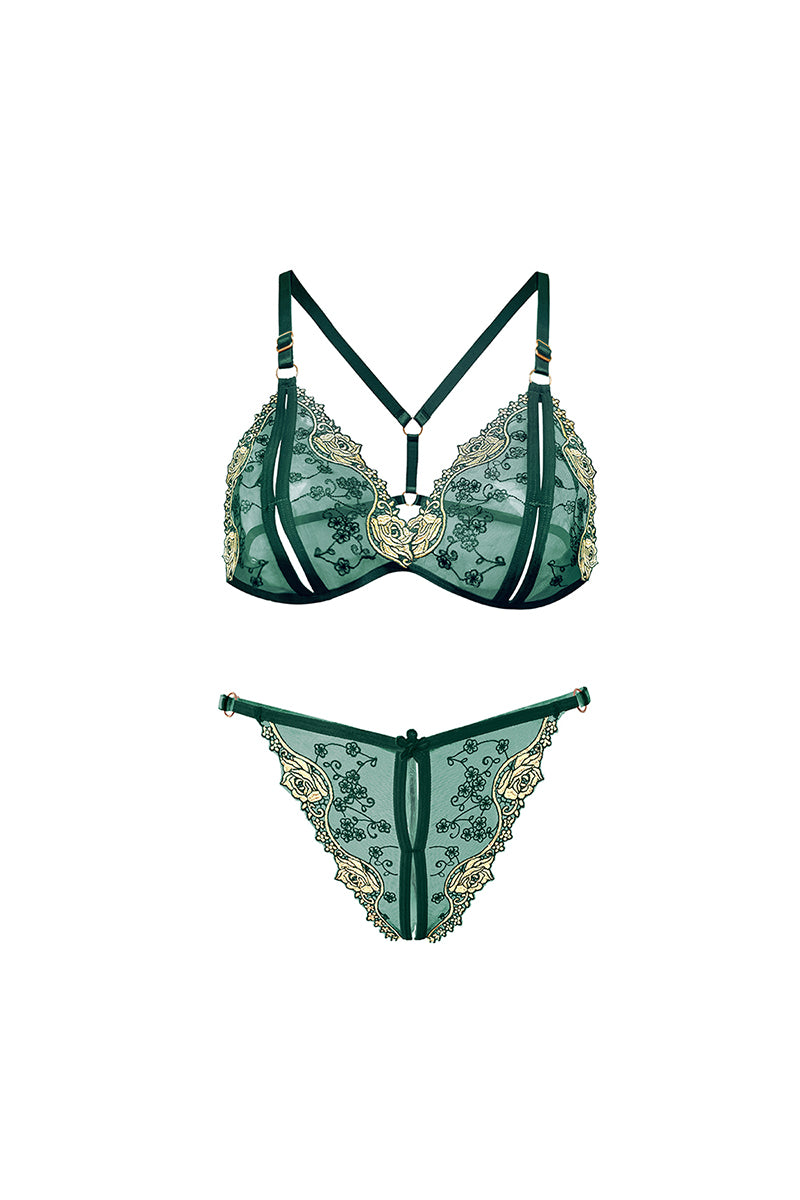 Set 2 piese lenjerie sexy cu broderie florala, verde cu broderie aurie, material plasa fina si elastan