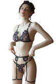 Set 3 piese lenjerie cu broderie florala, sutien, chilot tanga si portjartiera, Negru si Roz - Descriere si Caracteristici