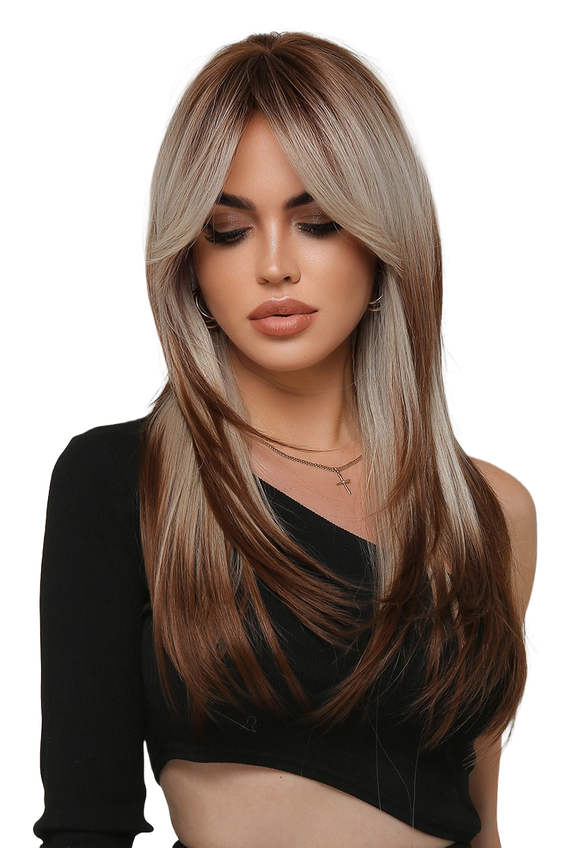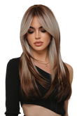 Peruca par lung de culoare satena cu suvite blonde, tunsoare este in scari cu breton.