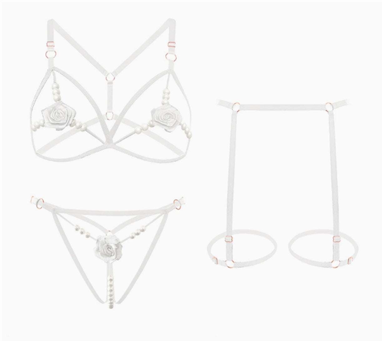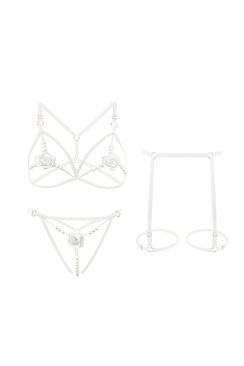 Set 3 piese lenjerie sexy din benzi elastice cu flori 3D si margele, Alb - Descriere si Caracteristici