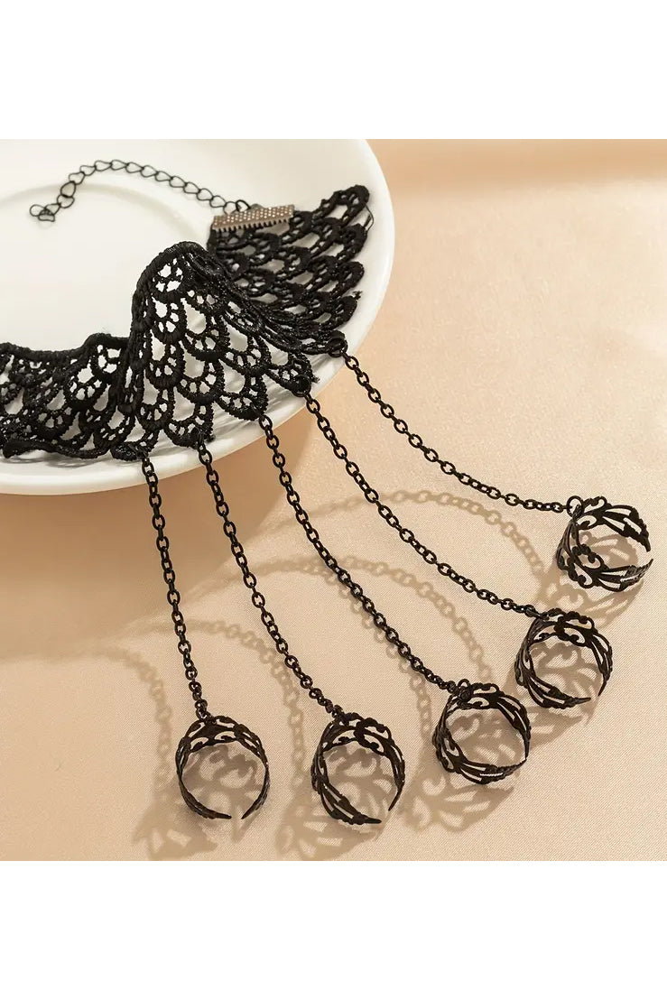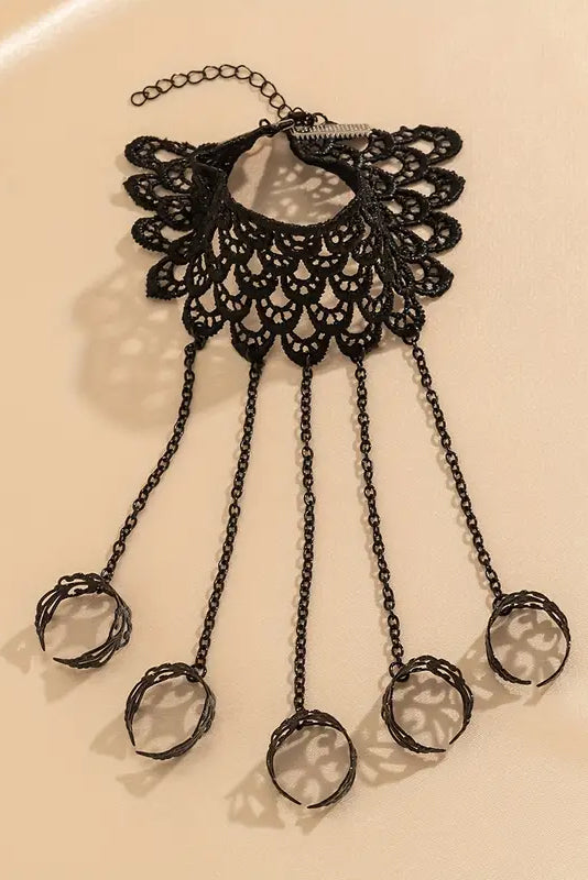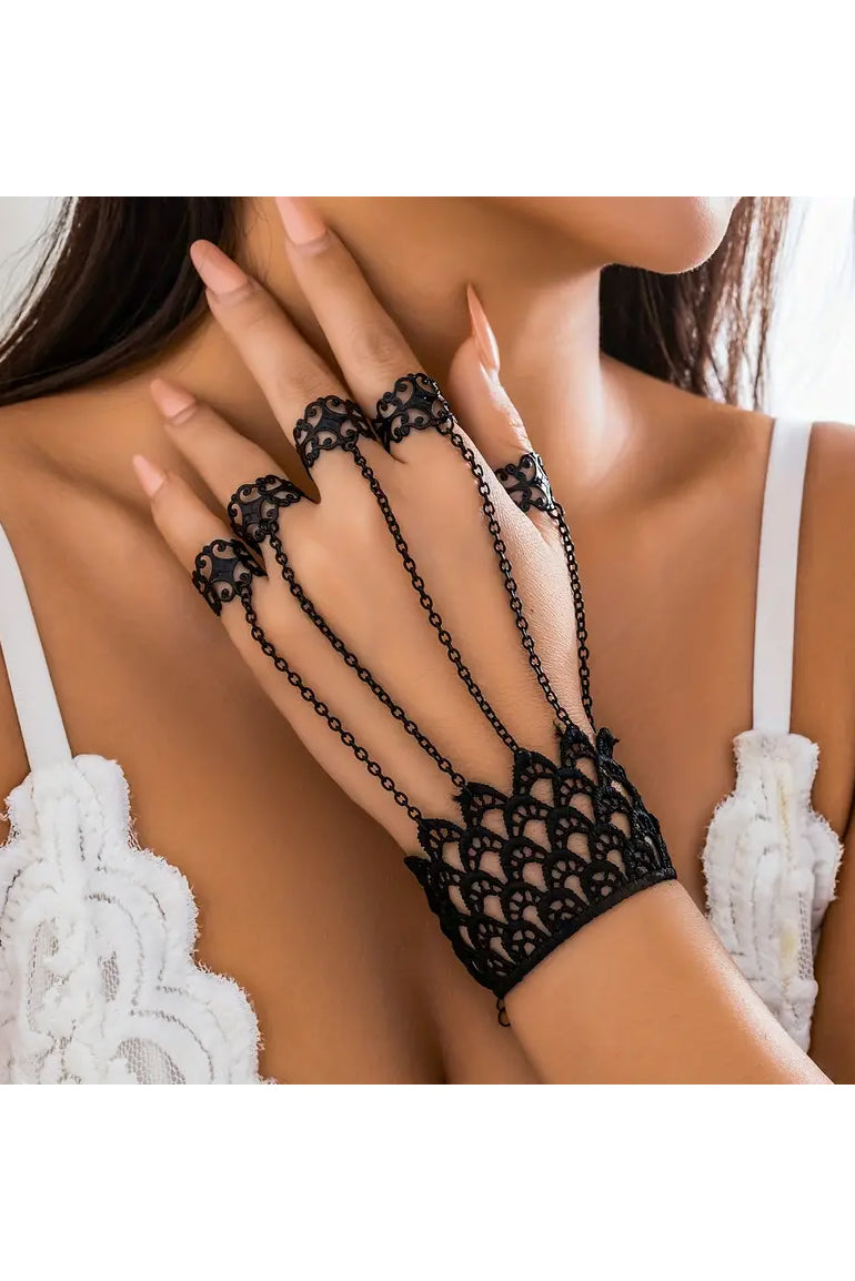 Transformă-ți apariția cu acest accesoriu inedit pentru mâini, de tip mănuși, realizat din dantelă și lanțuri metalice. Brățara din dantelă are prindere reglabilă la încheietură, iar cele 5 lanțuri metalice care se îndreaptă spre degete adaugă un element edgy. Accesoriul este completat de 5 inele metalice reglabile, conferind un stil fashion și modern. Fabricat din 100% acrilic, acest accesoriu aduce o notă de originalitate și eleganță oricărei ținute.