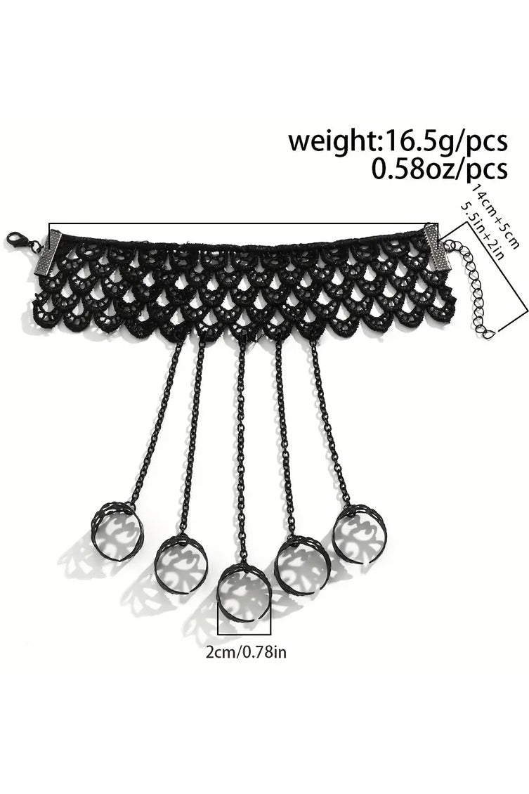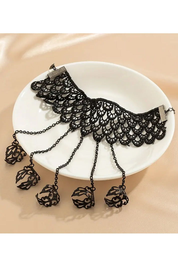 AC296-1 Accesoriu gat tip chocker "Gothic Style" din broderie accesorizat cu brosa, margele si lanturi