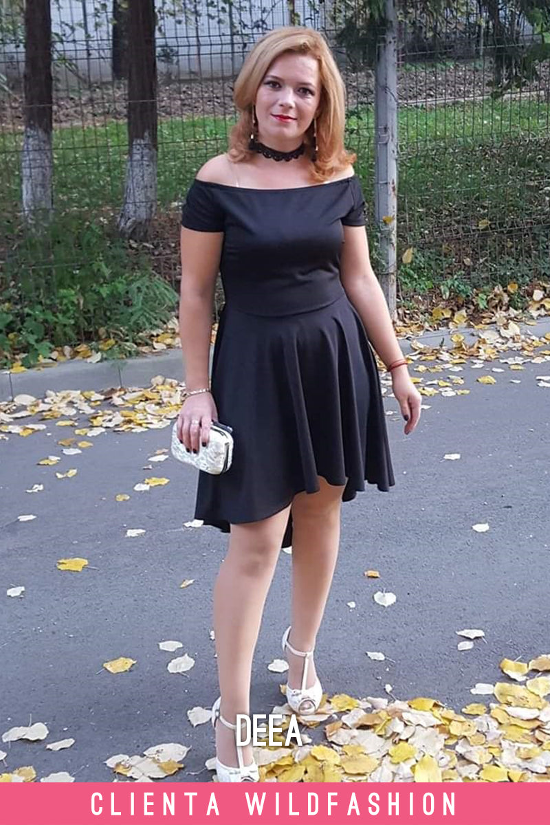 Rochie scurta asimetrica tip skater, de cocktail, cu umerii goi, maneci scurte si inchidere cu fermoar lateral.