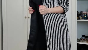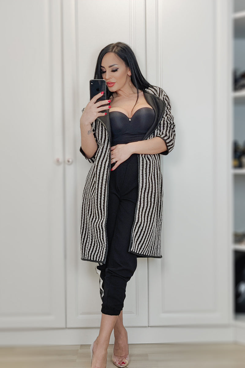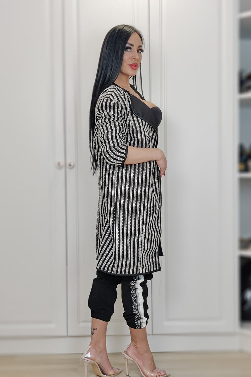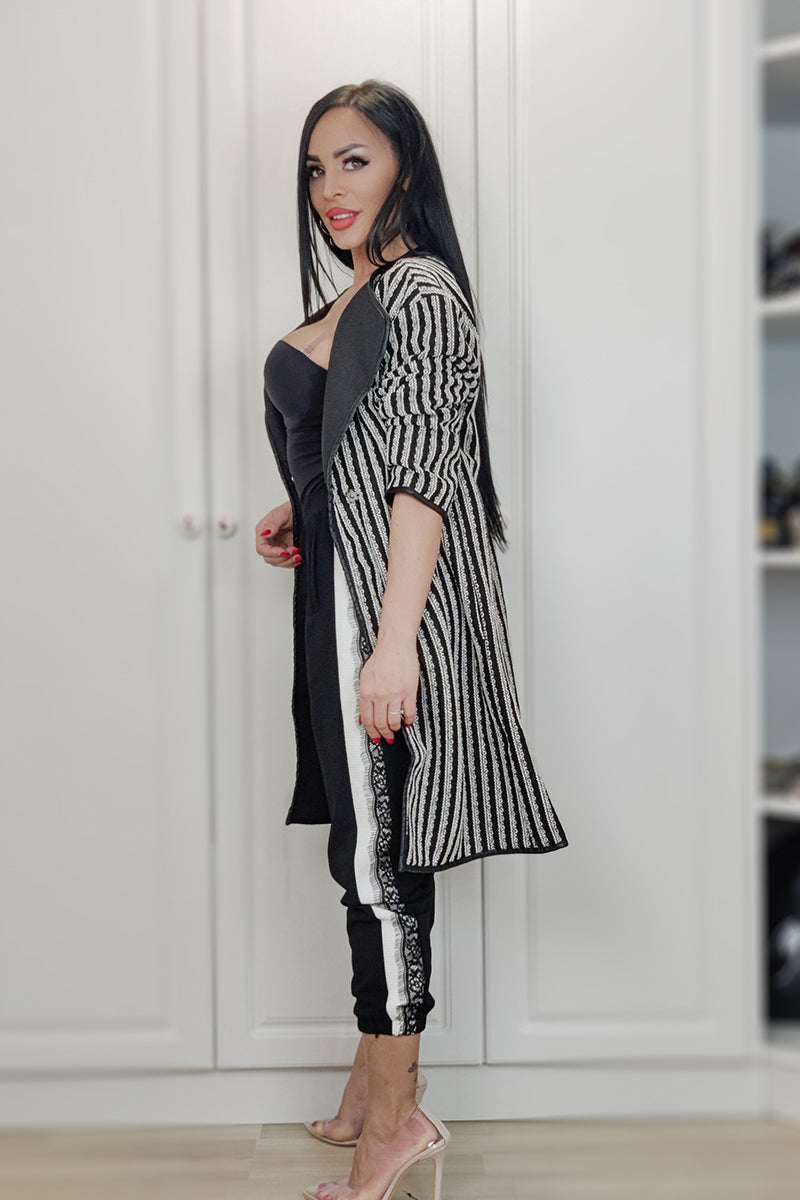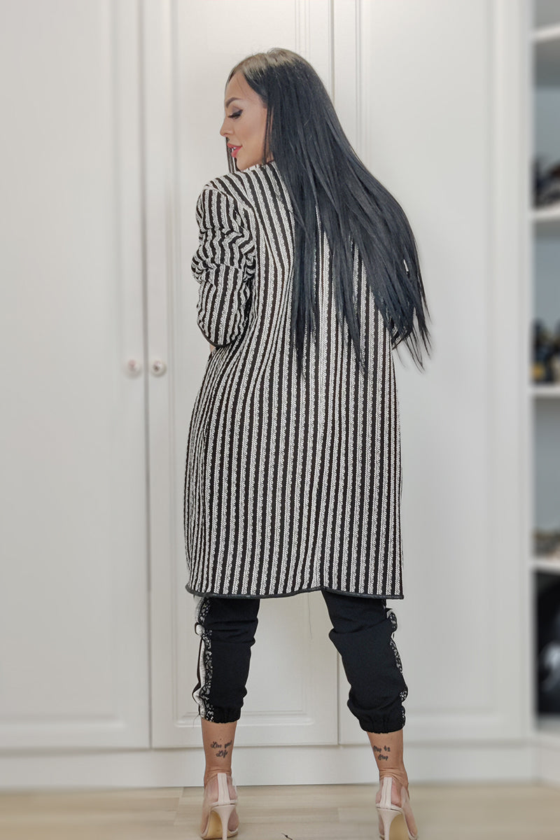 Palton midi cu model alb-negru maneci lungi si inchidere cu capse.