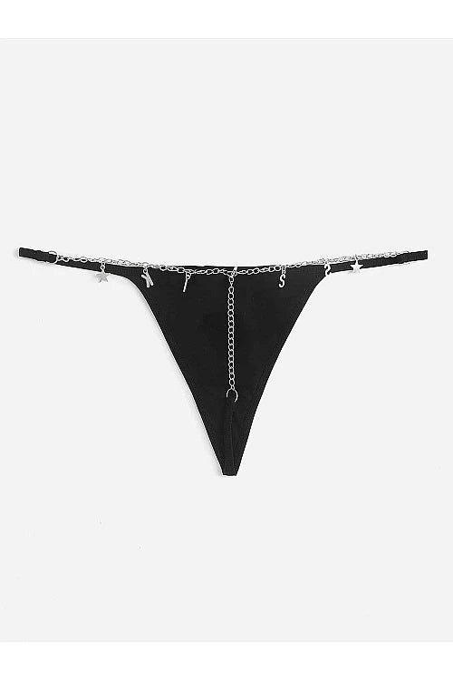 Chilot sexy din material elastic negru si lant cu litere metalice - KISS: Acest chilot sexy este realizat dintr-un material elastic semitransparent, oferind un look seducator si confortabil. Spatele este accesorizat cu un lant si litere metalice care formeaza cuvantul "KISS", adaugand o nota provocatoare si distinctiva. Fabricat din poliester si aliaj metalic, acest chilot combina stilul cu durabilitatea, fiind perfect pentru momentele speciale.