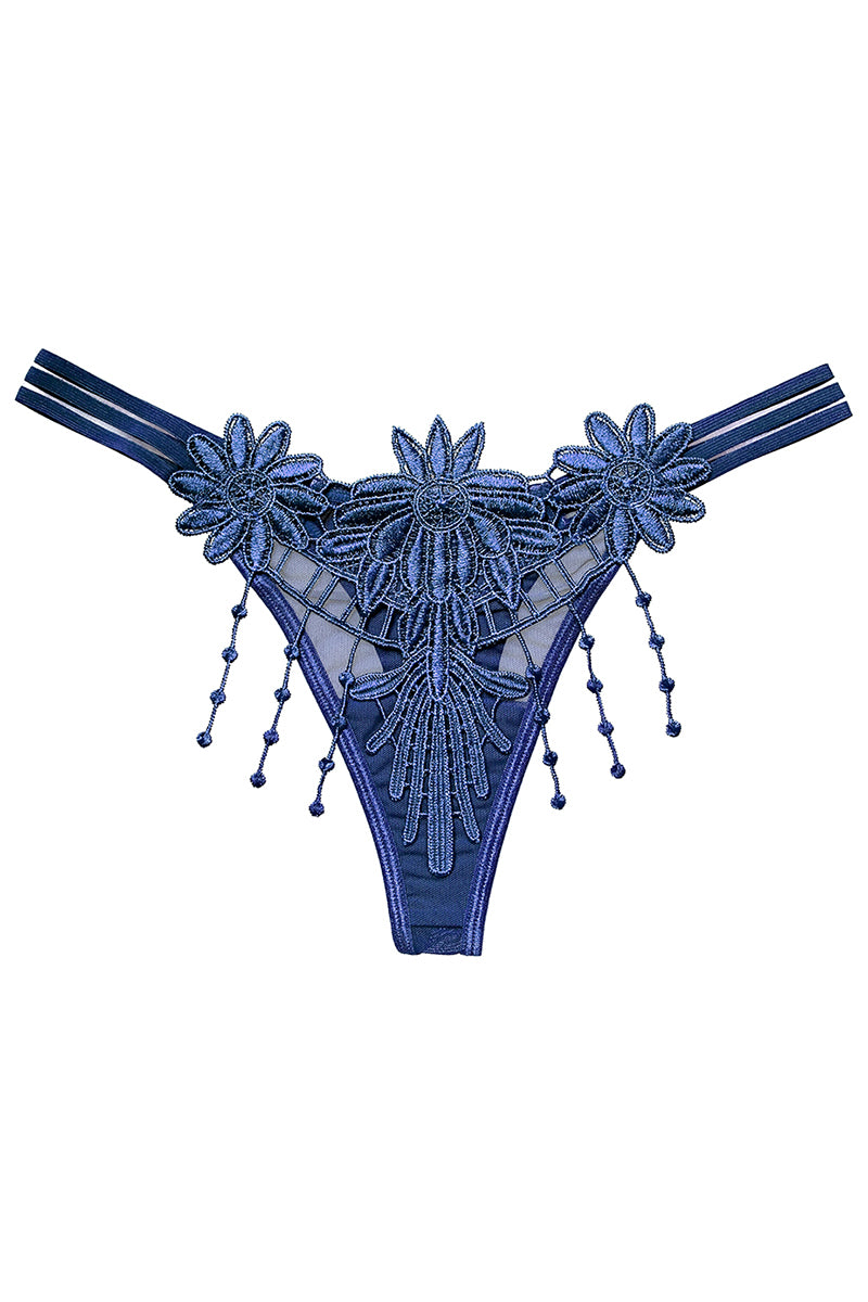 Chilot tanga din plasa fina cu broderie florala si benzi laterale elastice, Bleumarin – Descriere si Caracteristici