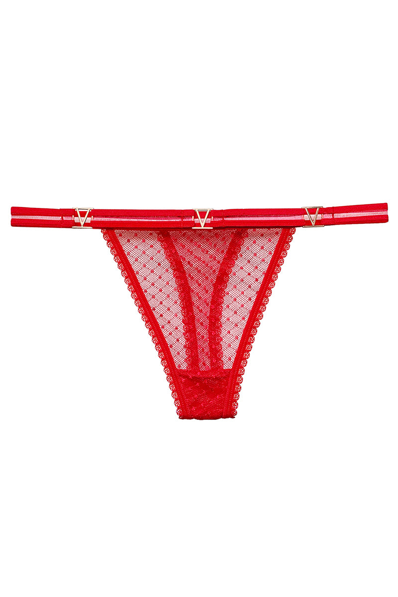 Chilot tanga sexy din plasa fina cu dantela elastica si detalii metalice – design elegant, Rosu