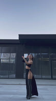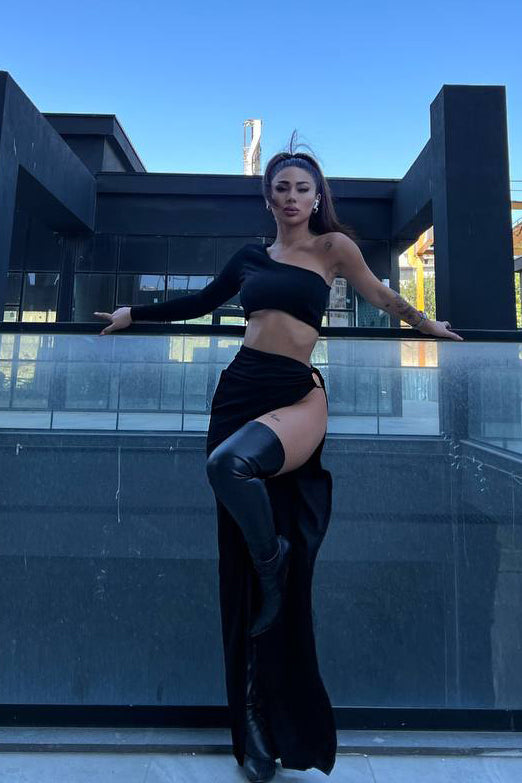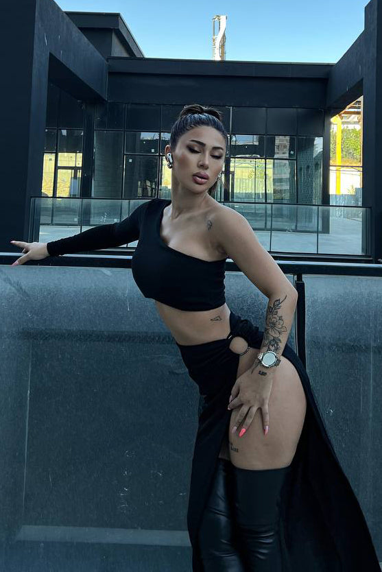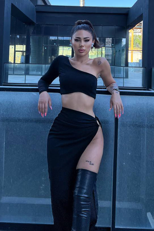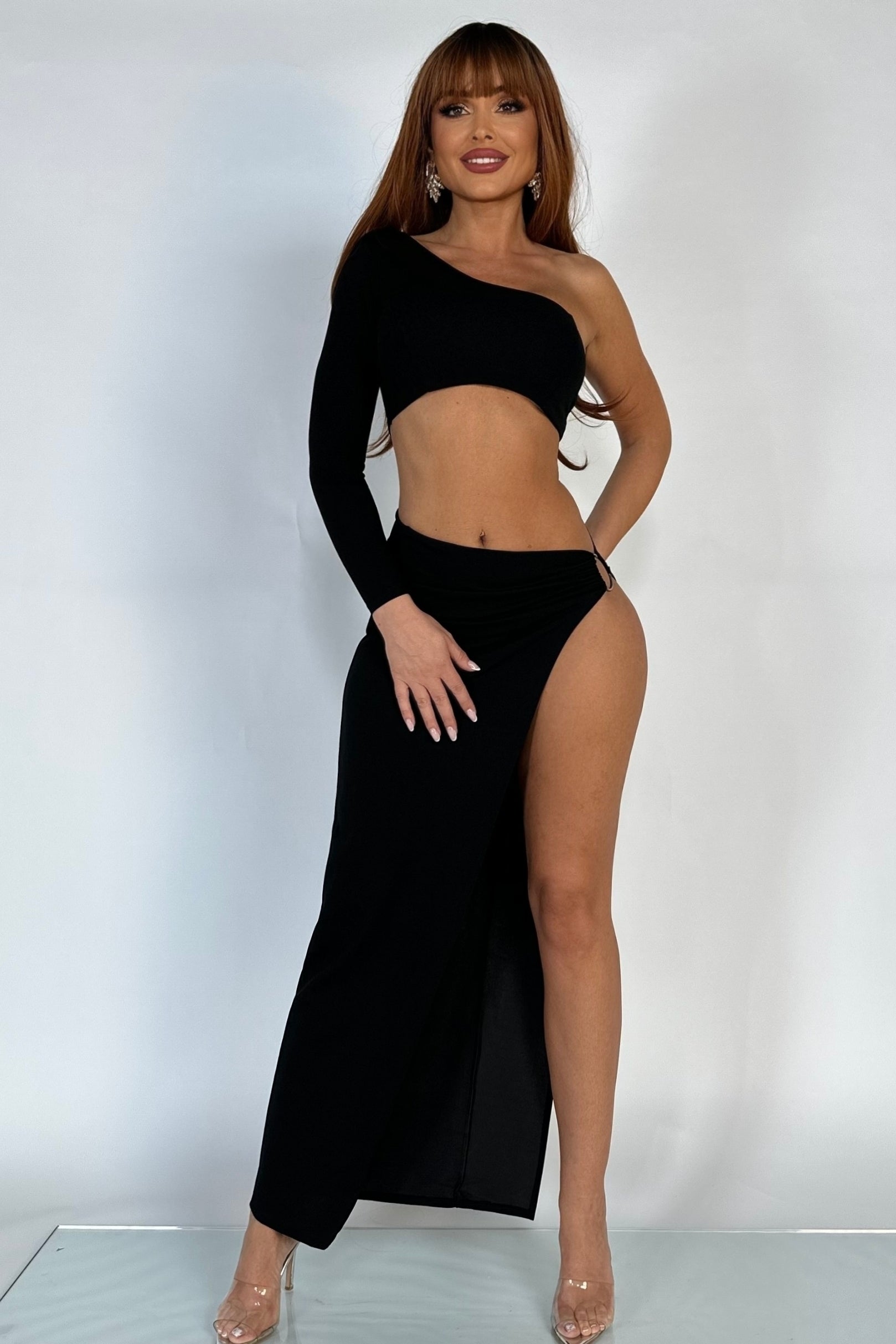 Compleul casual din top si pantaloni lungi accesorizat cu inel metalic este o alegere indrazneata si sofisticata pentru orice eveniment. Realizat dintr-un material usor elastic, acest compleu provocator ofera atat confort, cat si stil. Topul tip bustiera, cu o singura maneca, este captusit in intregime, asigurand o potrivire perfecta si un look elegant. Fusta lunga, accesorizata cu un inel metalic si cu o crapatura ampla pe picior, adauga un element de senzualitate si rafinament. Materialul de inalta calitate, compus din 90% poliester si 10% elastan, asigura durabilitate si o croiala impecabila.