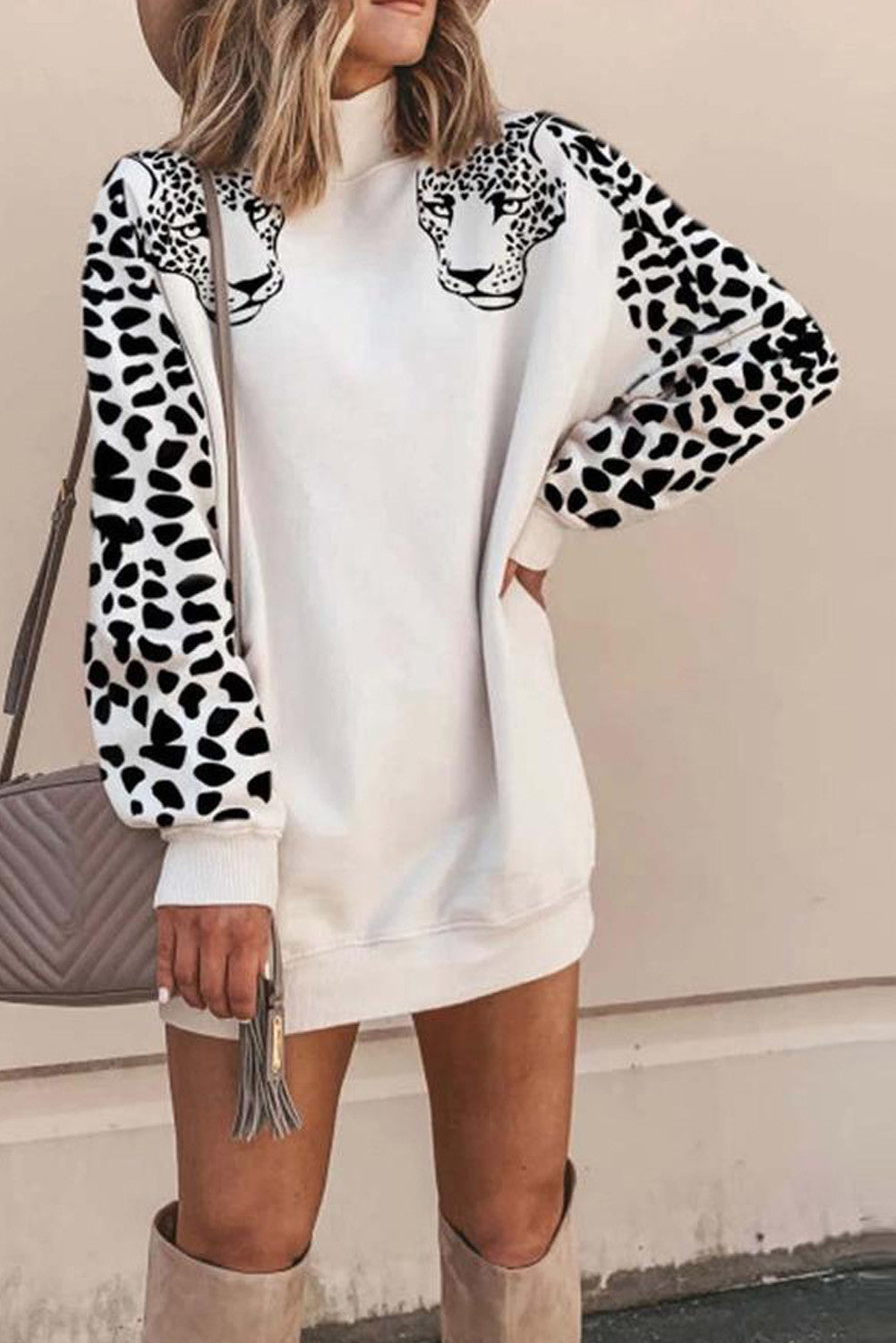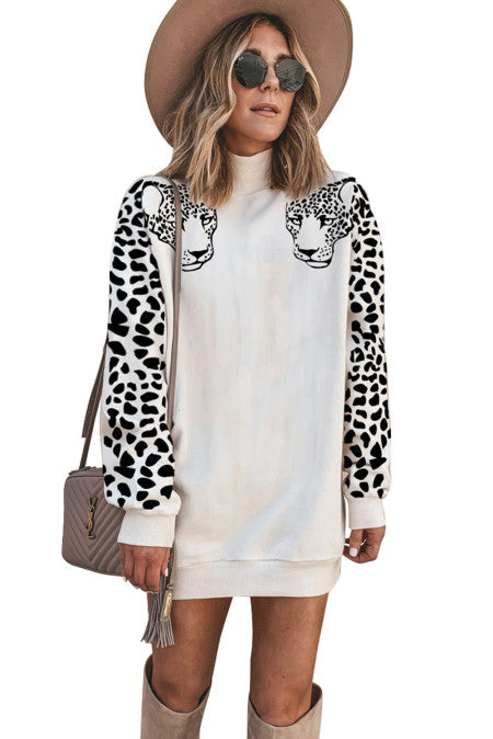 Rochie scurta alb-negru cu print leopard guler inalt maneci lungi si mansete late.