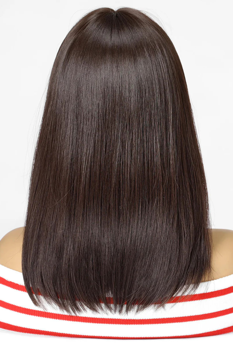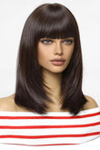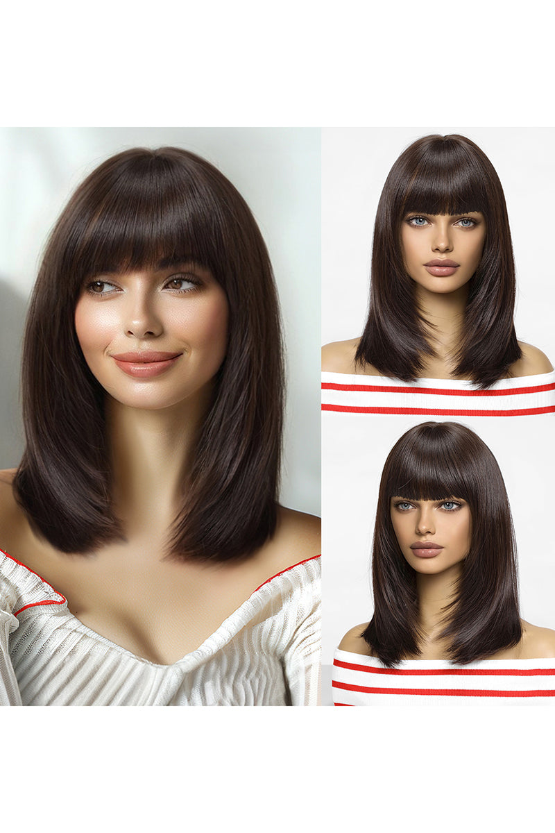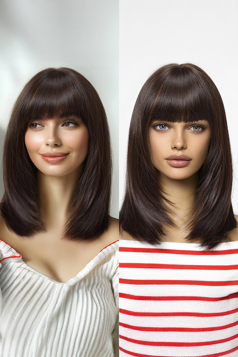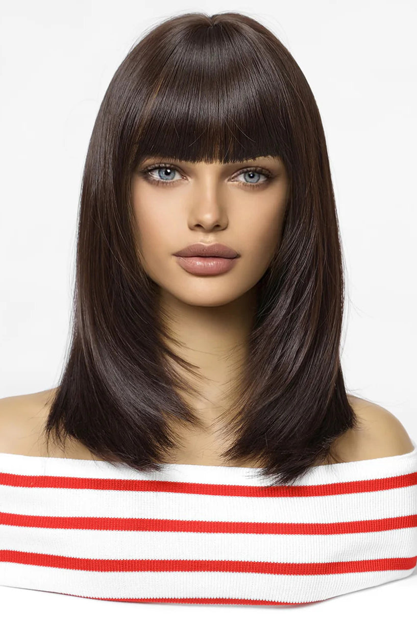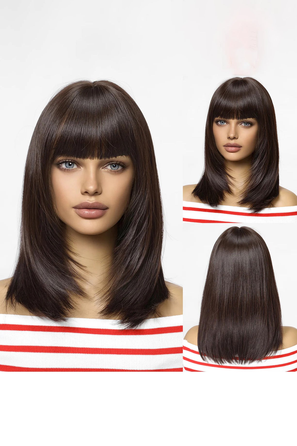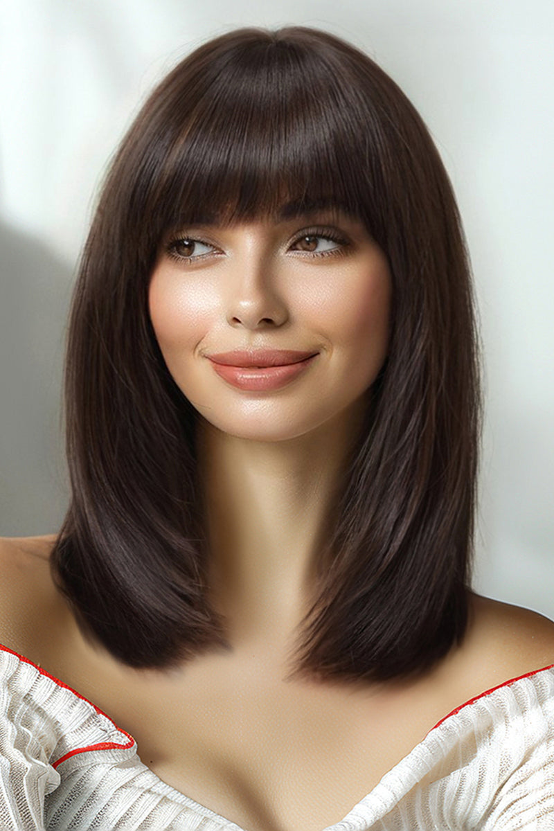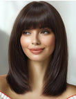 Peruca medie saten inchis cu breton drept din fibre sintetice premium, PER154-8888