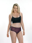 Chilot clasic elastic din plasa fina semitransparenta in fata si dantela florala la spate accesorizata cu decupaje si strasuri snur elastic in talie si captusit inghinal