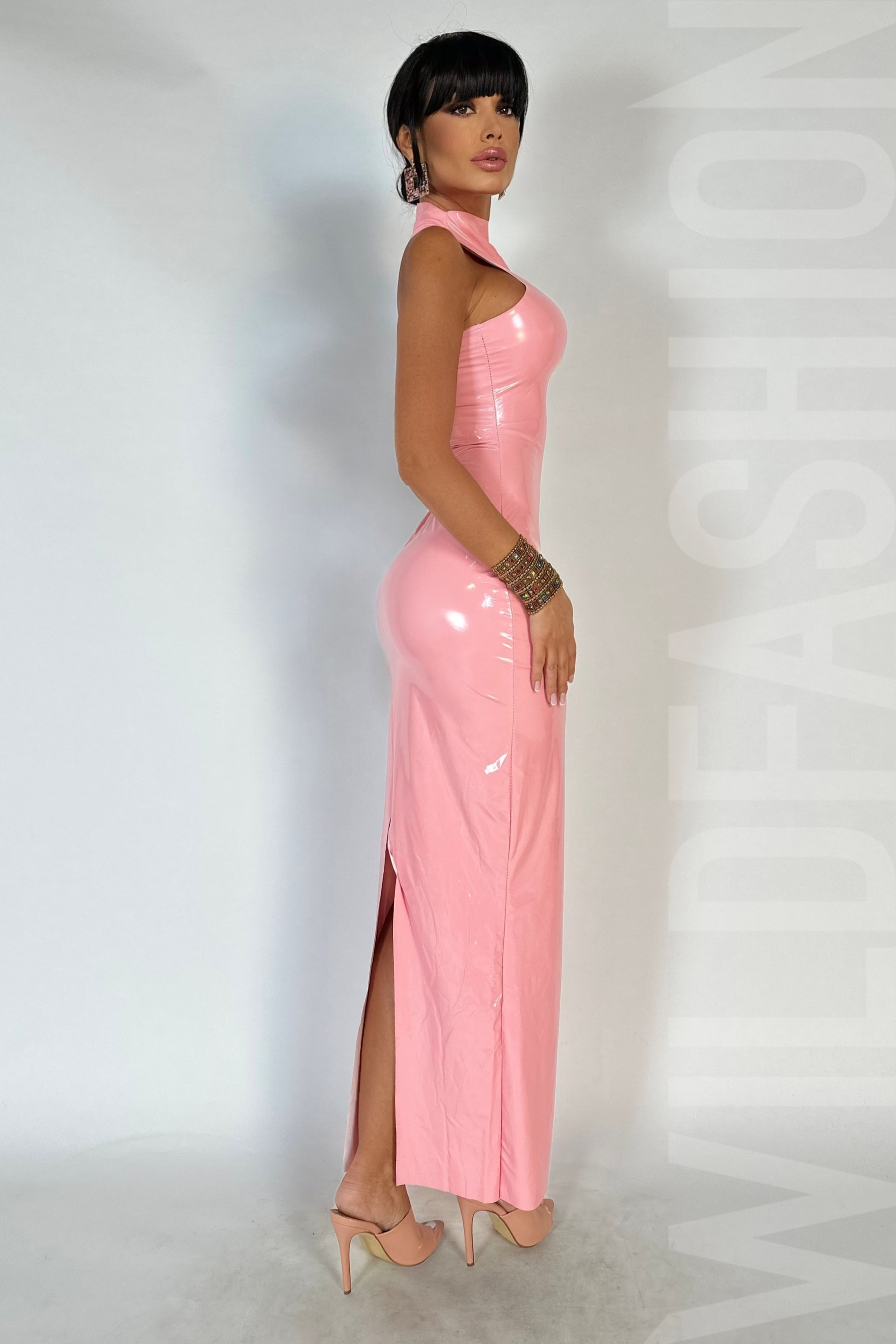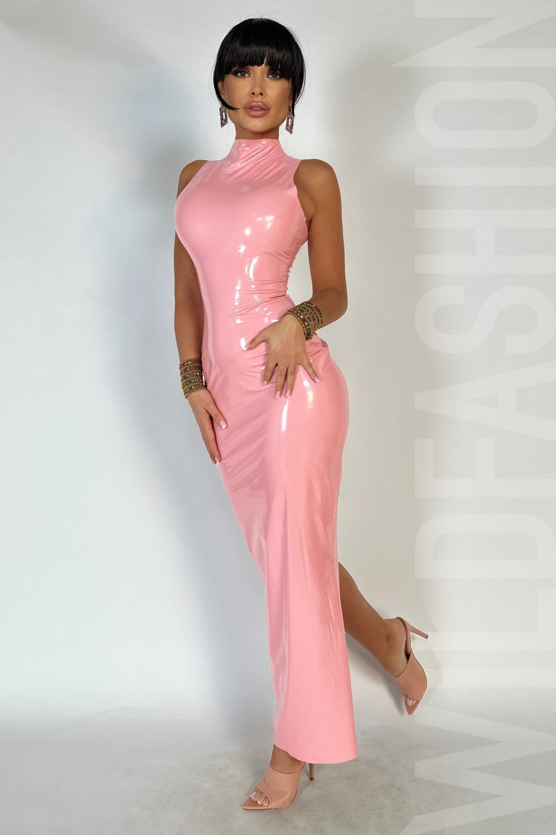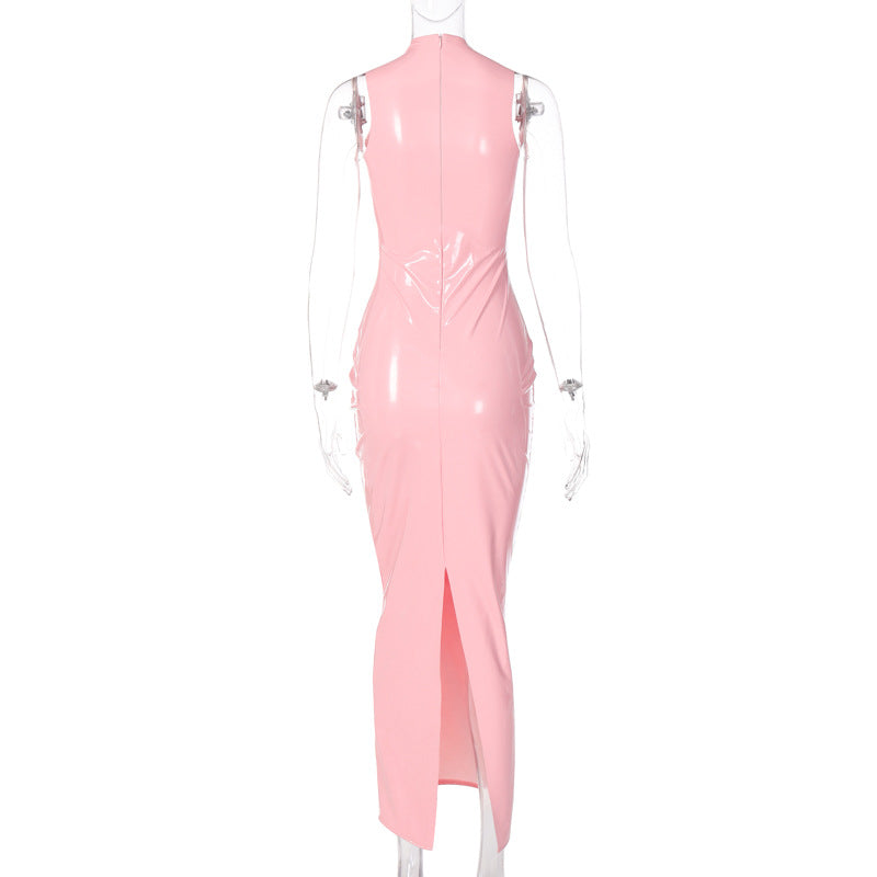 Aceasta rochie lunga fashion in nuanta delicata de roz macaron este un statement al stilului. Confectionata din vinil lucios usor elastic, aceasta rochie se remarca prin gulerul inalt si inchiderea cu fermoar ascuns la spate. Cu un design fara tivuri, prezinta o crapatura ampla la spate pentru un aspect modern si senzual.