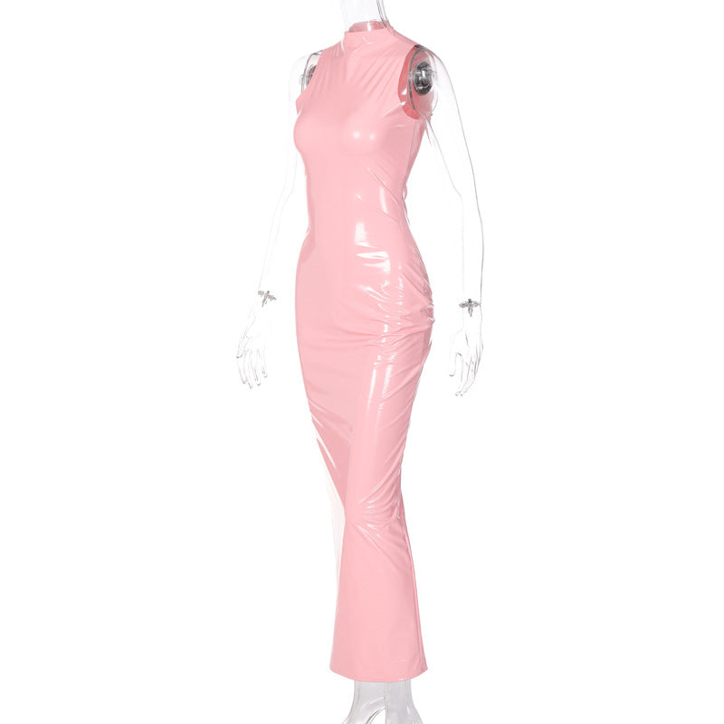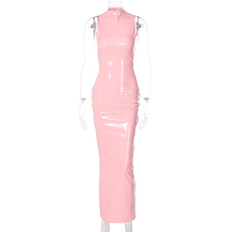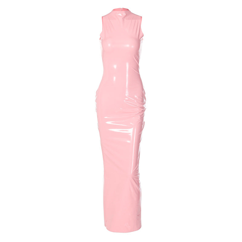 Rochie lunga fashion, roz macaron din vinil lucios usor elastic - Descriere si Caracteristici