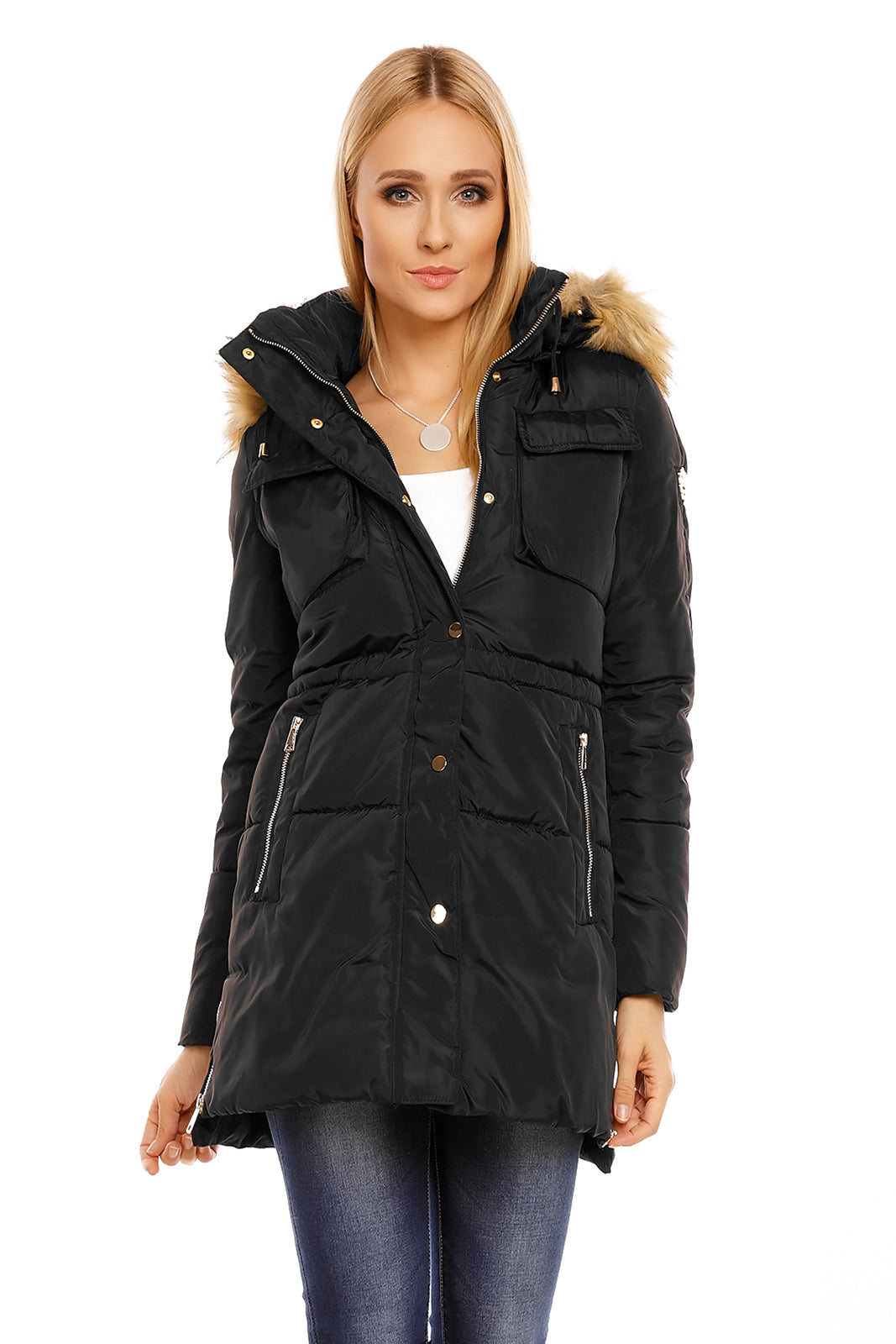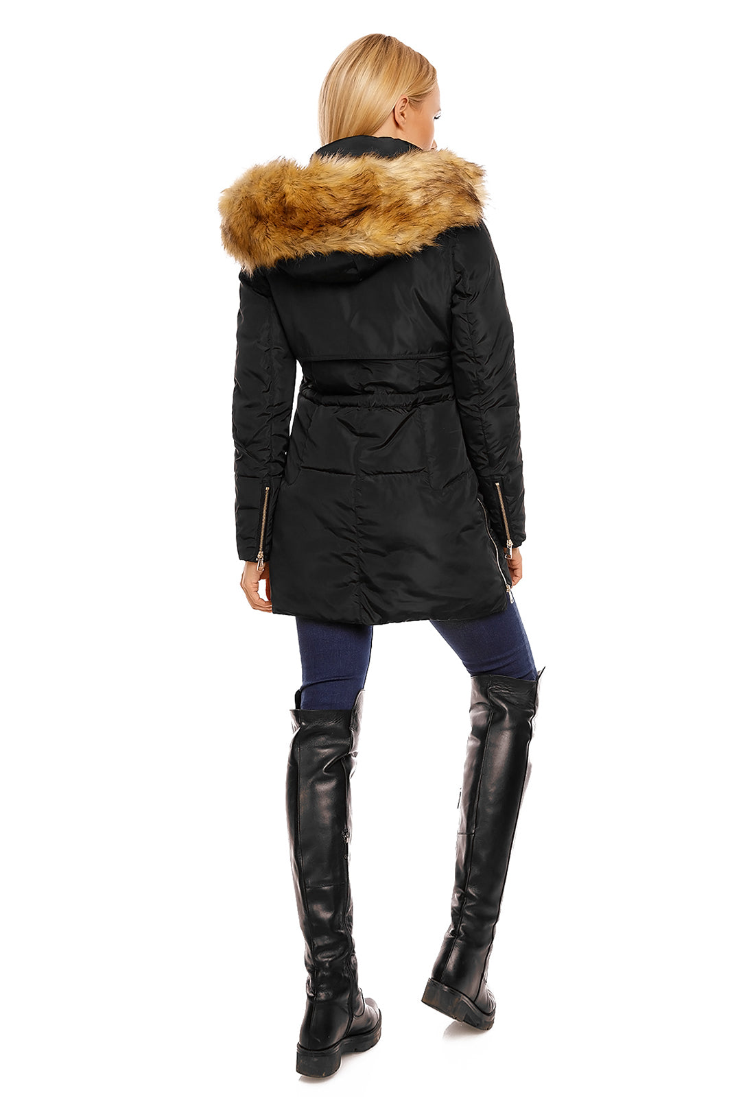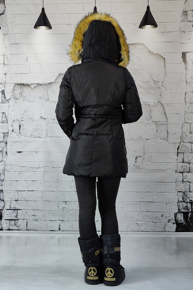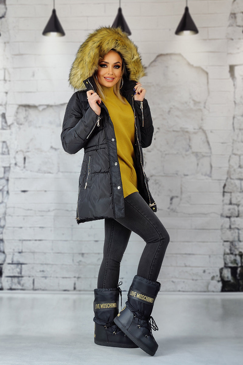 Geaca cu gluga pufoasa si fermoar la incheietura. Are patru buzunare dintre care doua in partea de sus si doua in lateral gulerul usor inalt. Geaca se inchide cu fermoar si capse in fata.