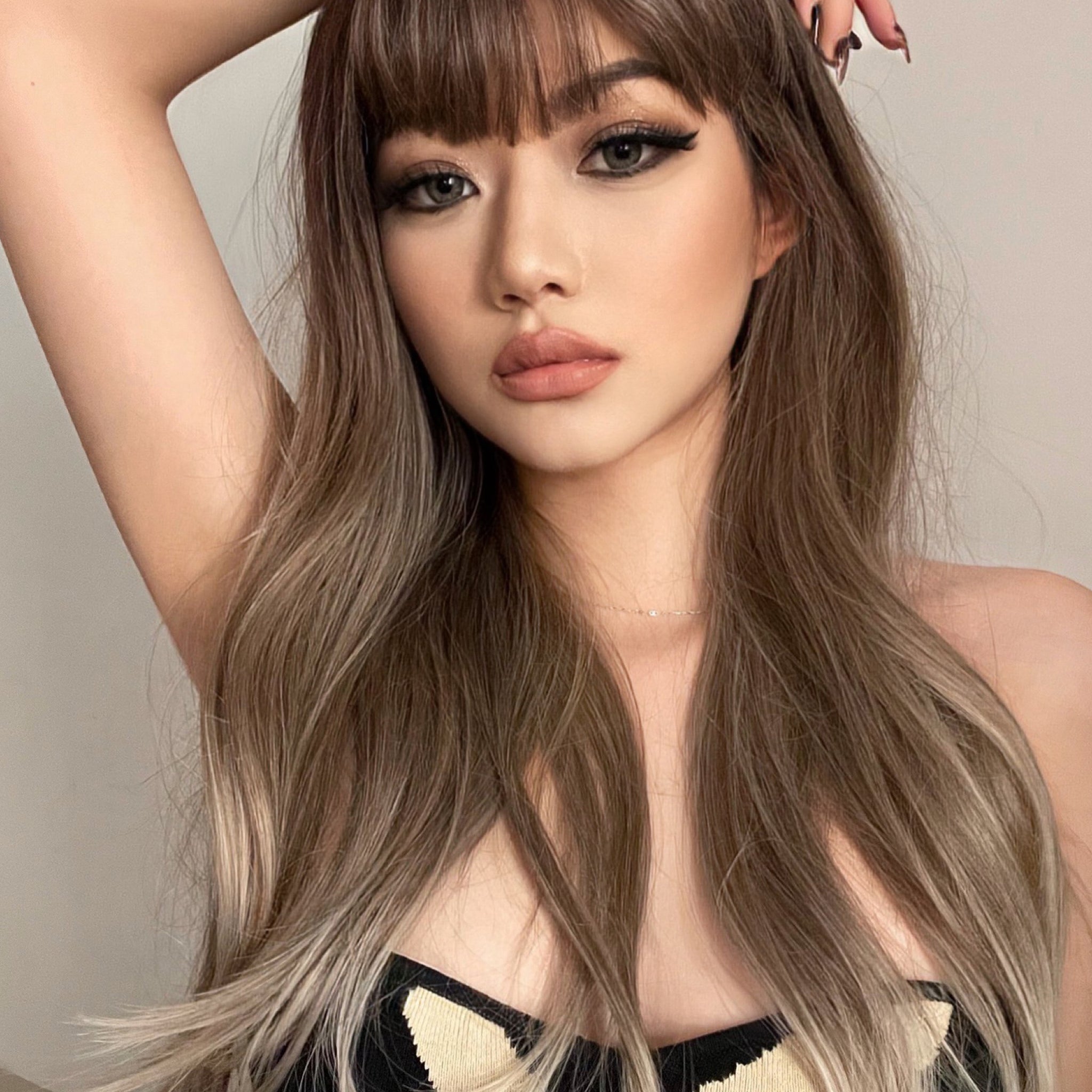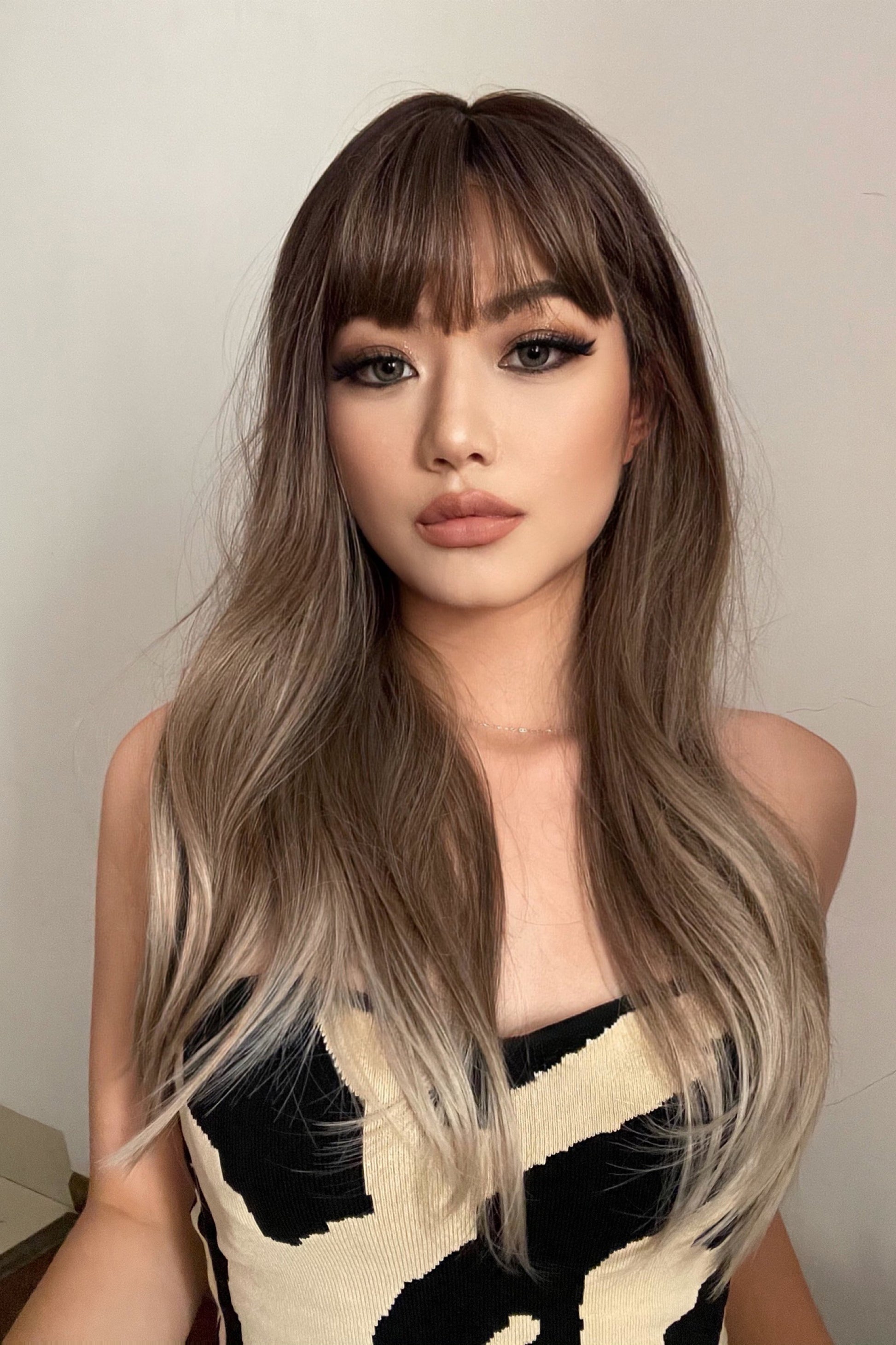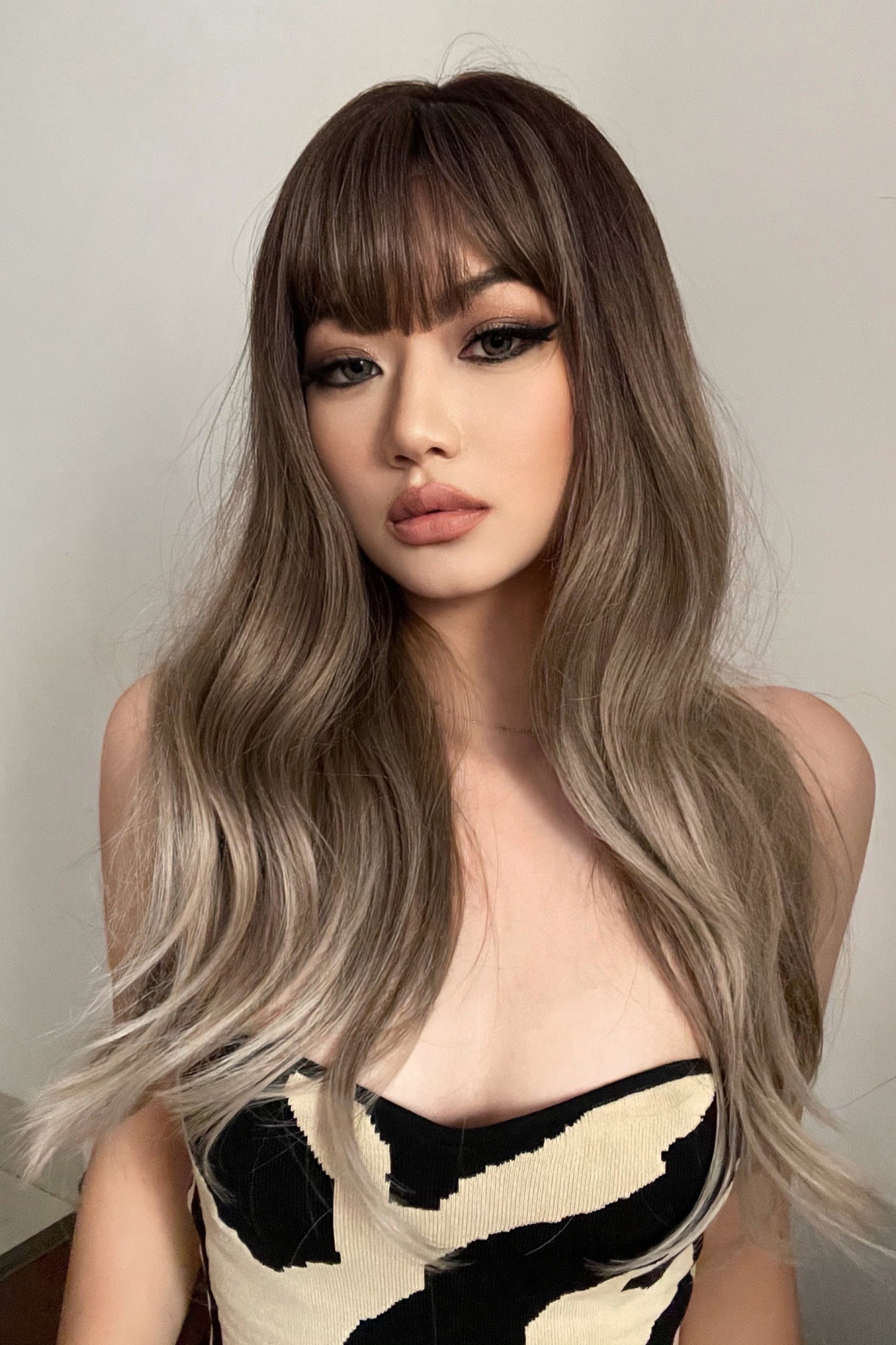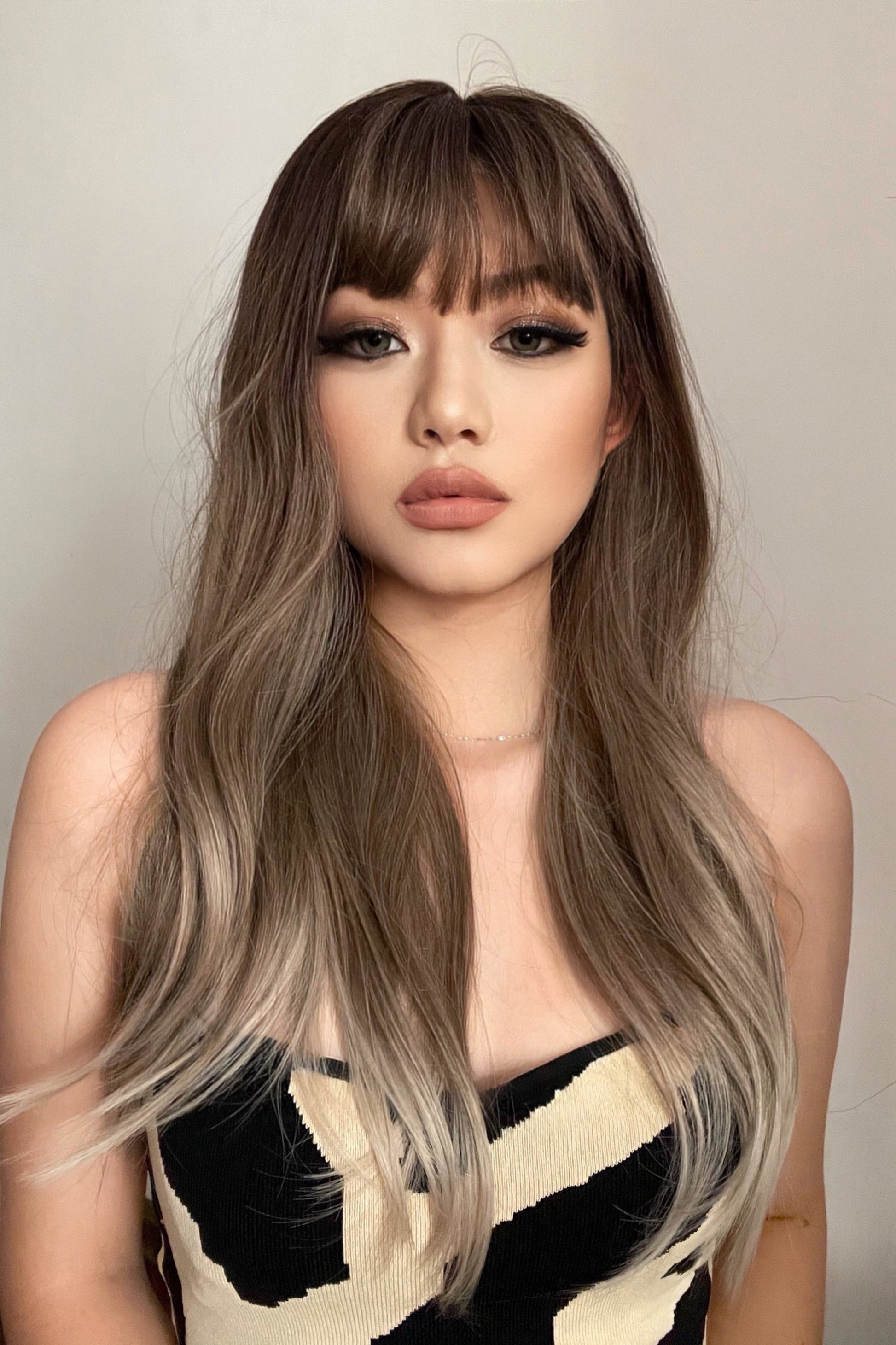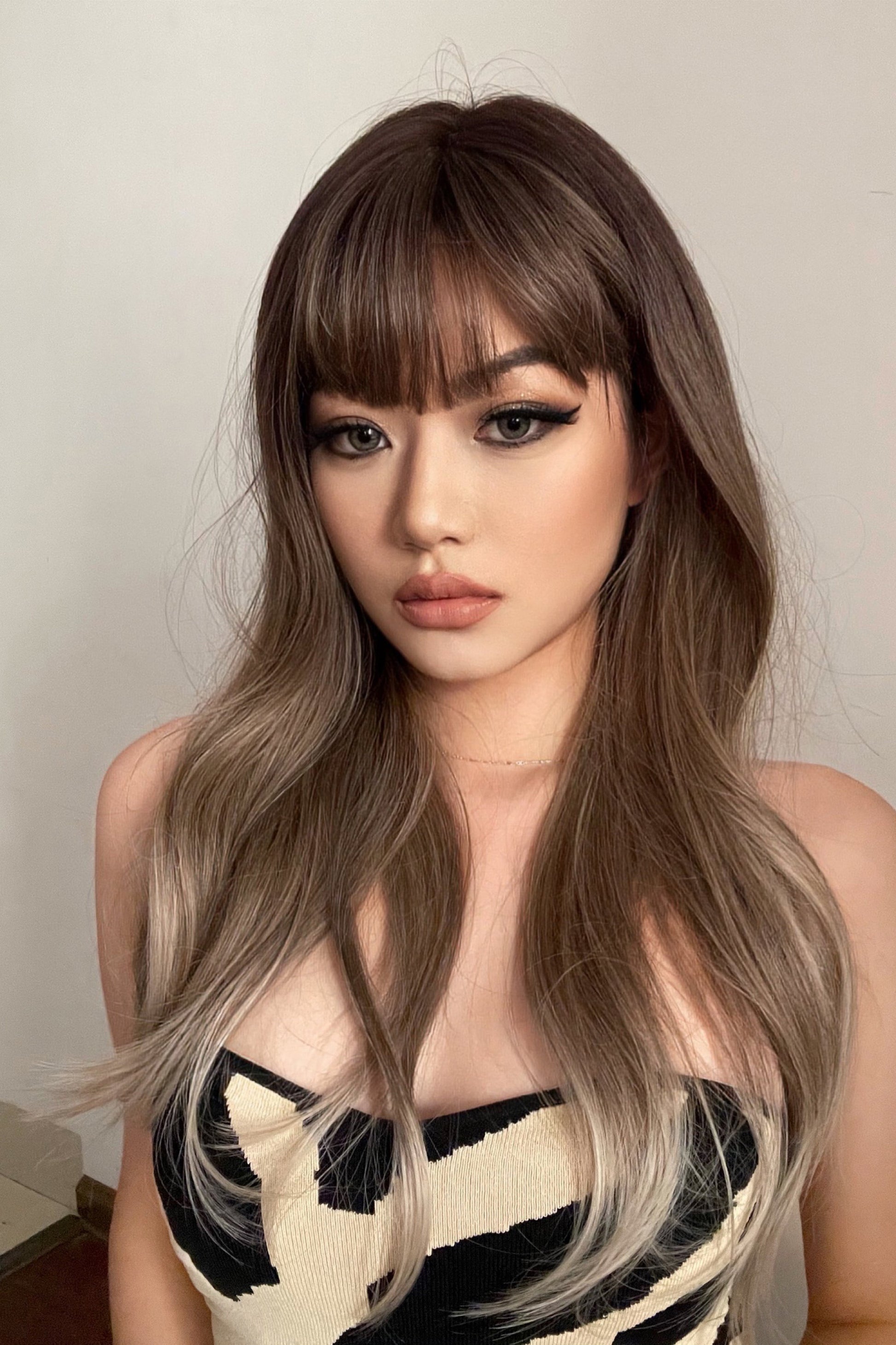 Peruca cu breton, bruneta cu blond, par lung usor ondulat.