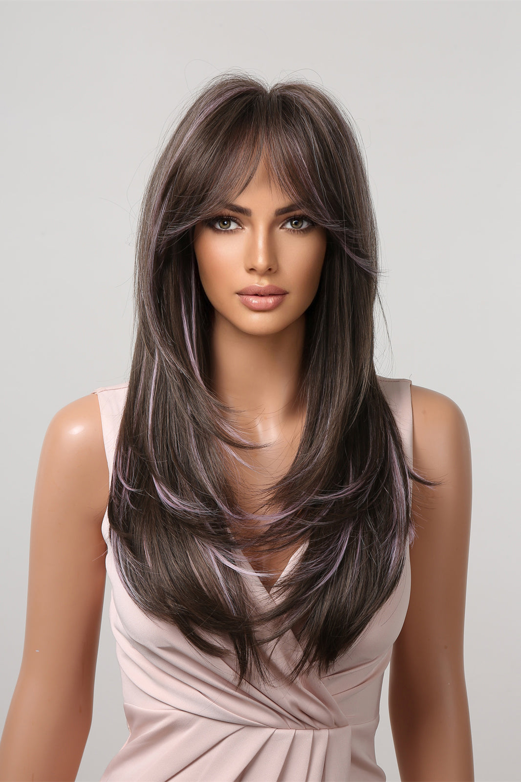 Peruca lunga brunet inchis cu suvite castanii ondulata 65 cm din fibre sintetice premium, PER153-8