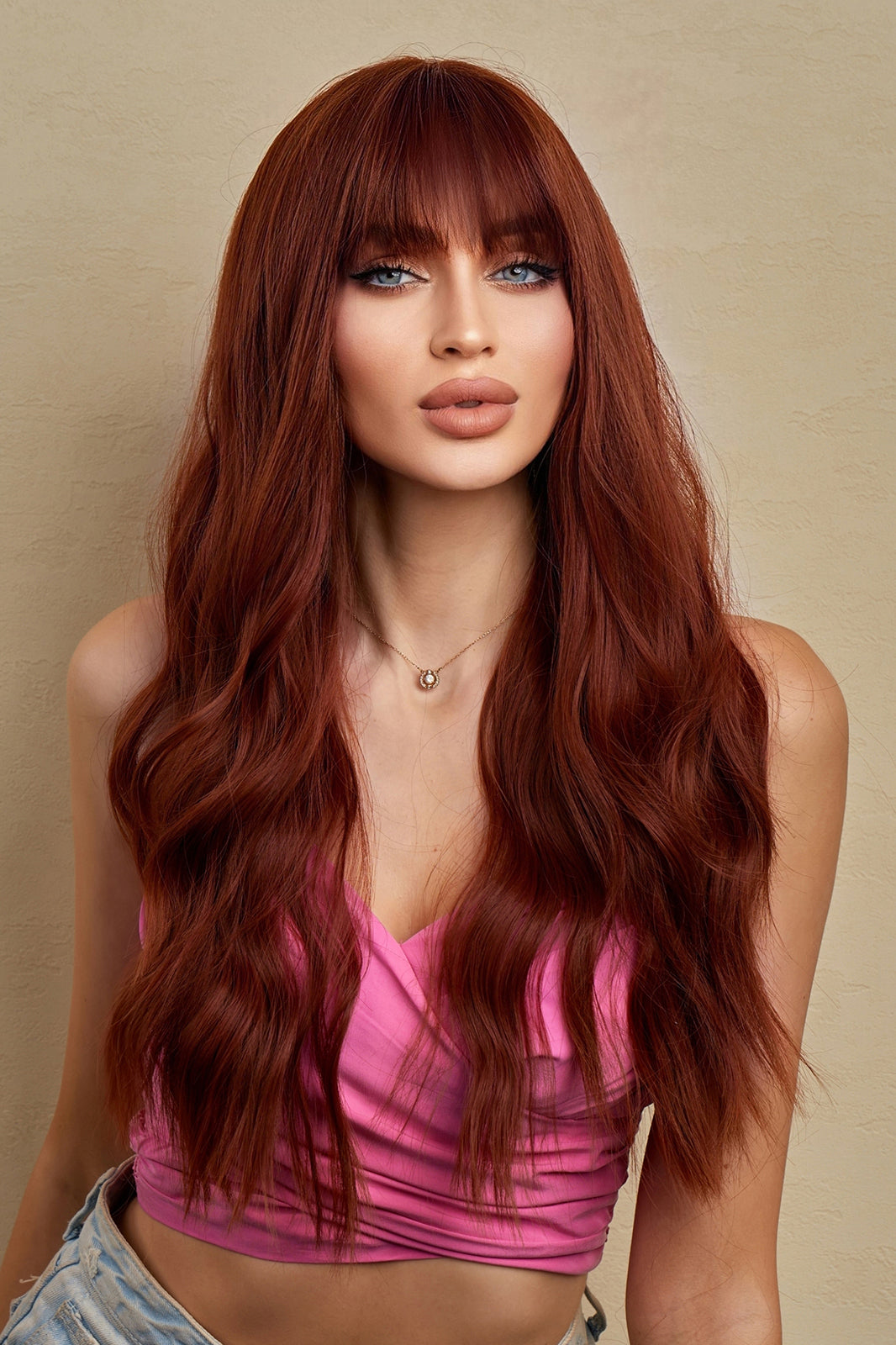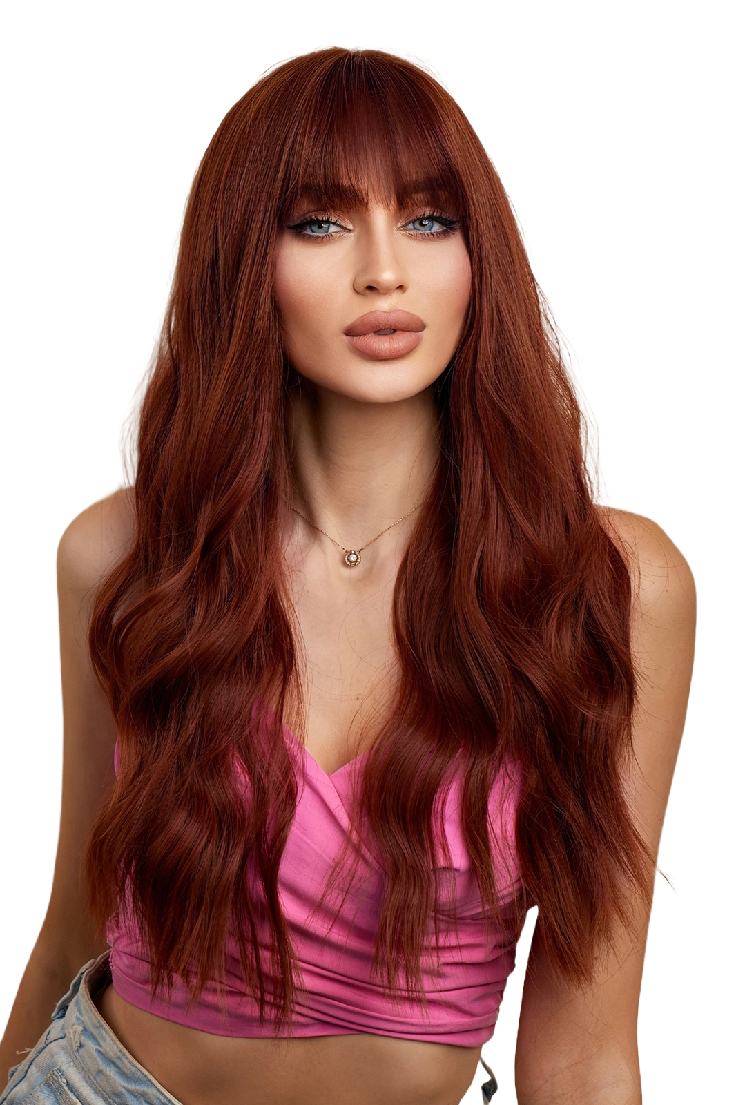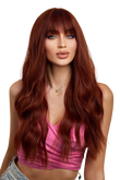 Peruca dama lunga ondulata rosu castaniu cu breton drept – fibra sintetica premium 60 cm, PER155-3838