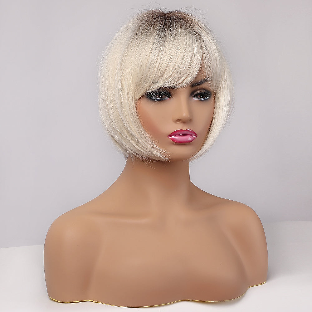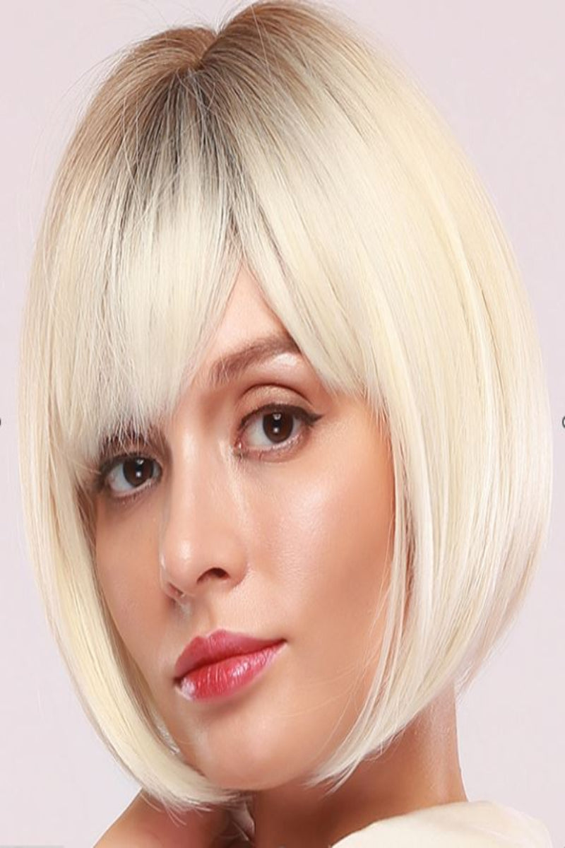 Peruca moderna dama bob mediu drept cu breton, nuanta blond cenusiu cu radacini inchise, PER154-922
