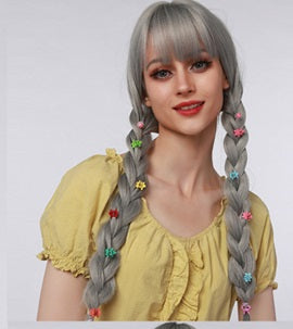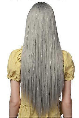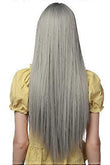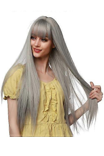 • Peruca lunga si dreapta, in nuanta gri argintiu moderna, cu breton plin ce incadreaza frumos fata.