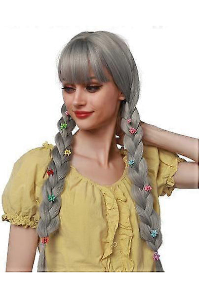 Peruca lunga gri argintiu cu breton, fibra sintetica premium