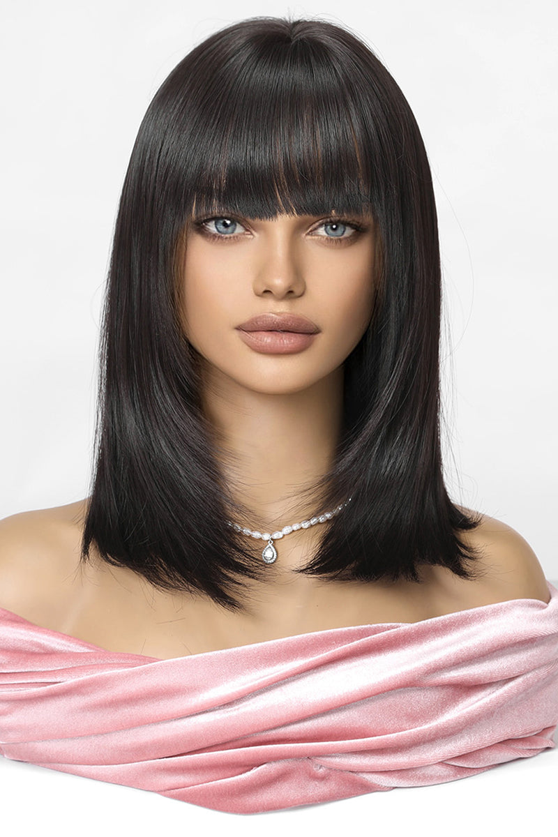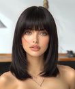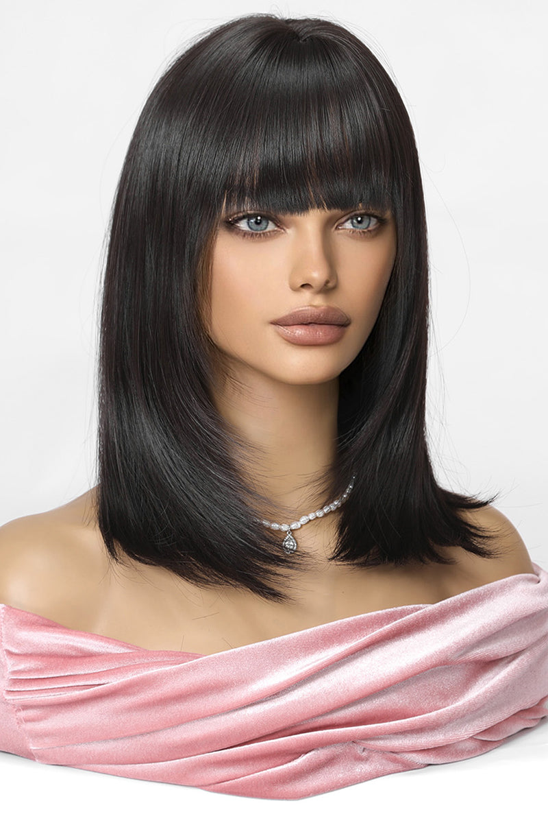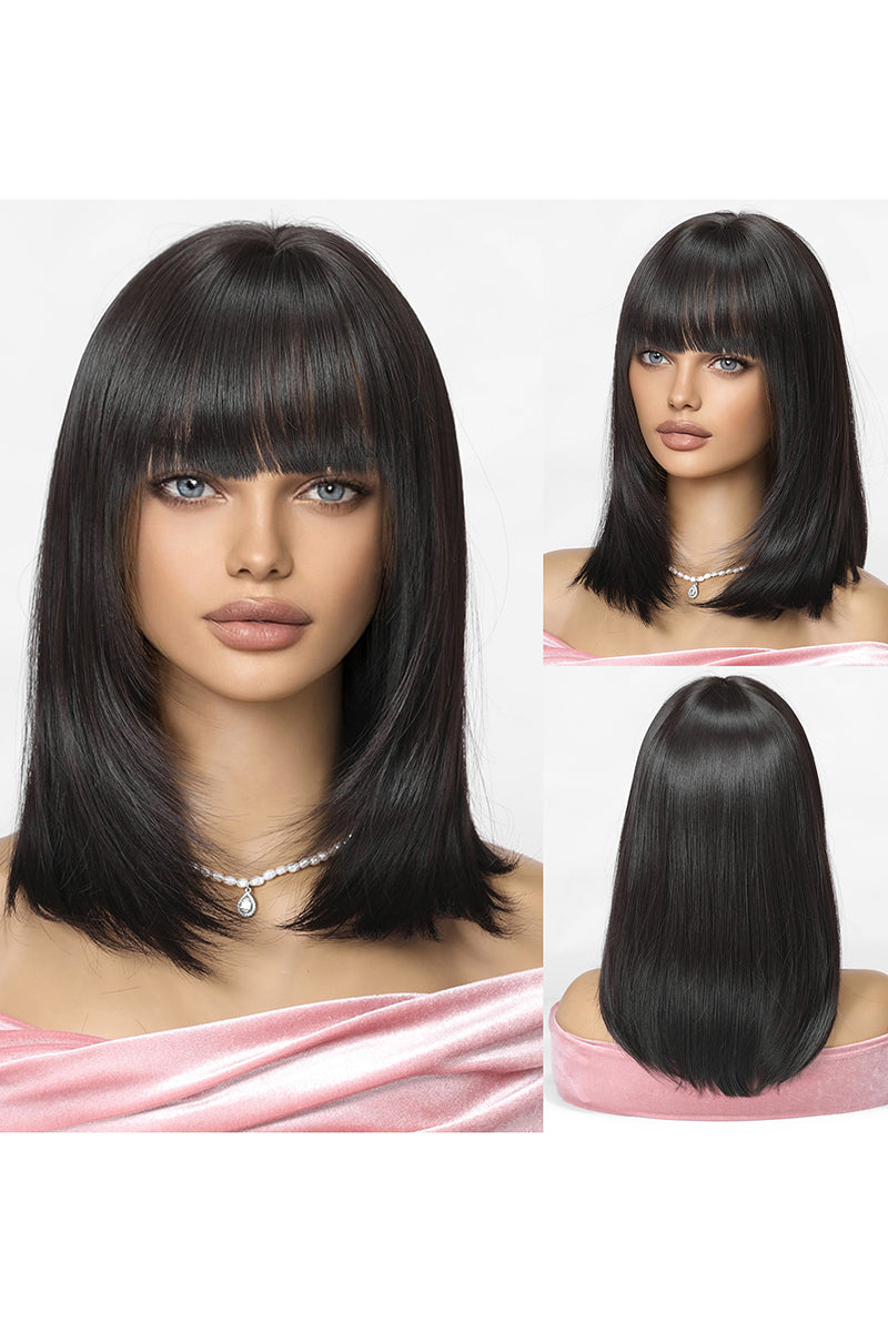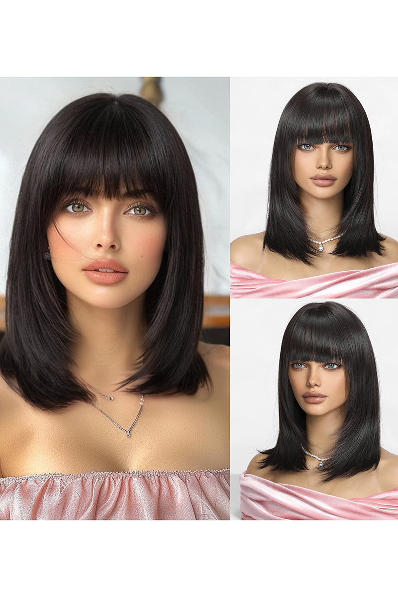 Peruca medie neagra cu breton drept, fibre sintetice premium