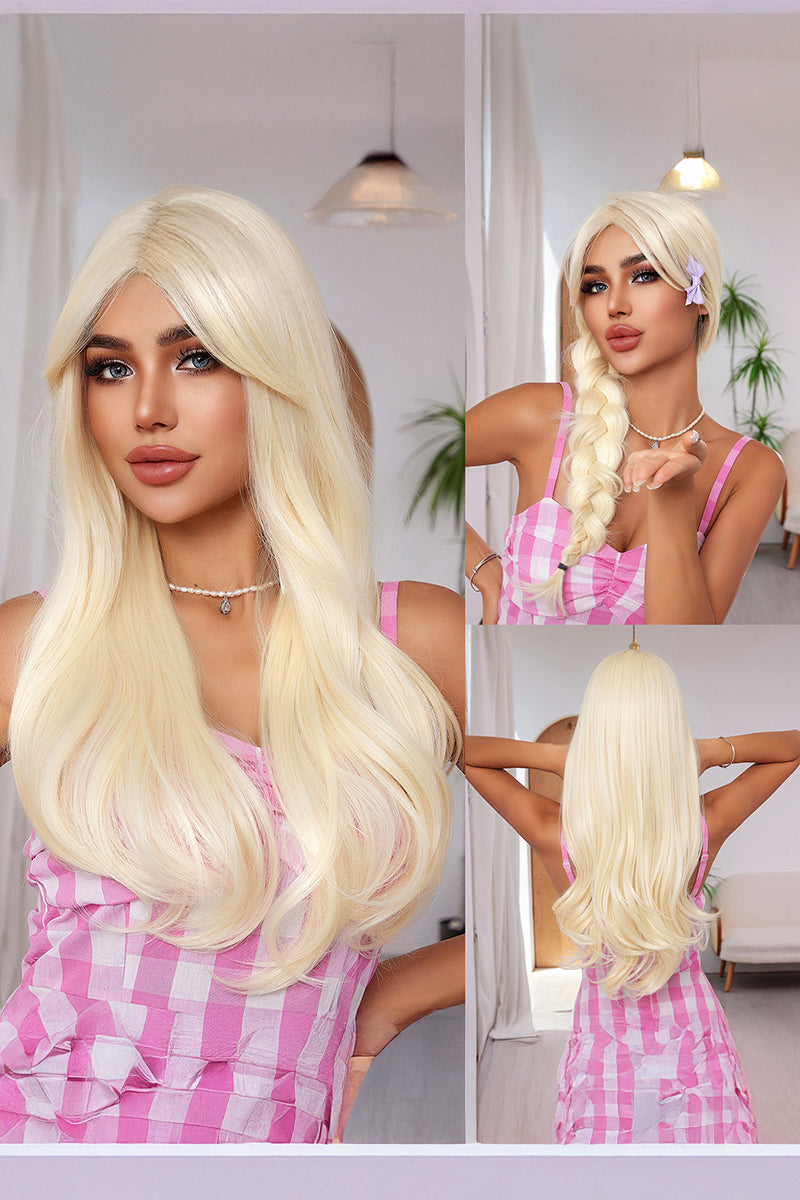 Aceasta peruca lunga blond platinat cu carare pe mijloc iti ofera un look modern, feminin si stralucitor, potrivit atat pentru tinutele casual cat si pentru evenimente speciale.