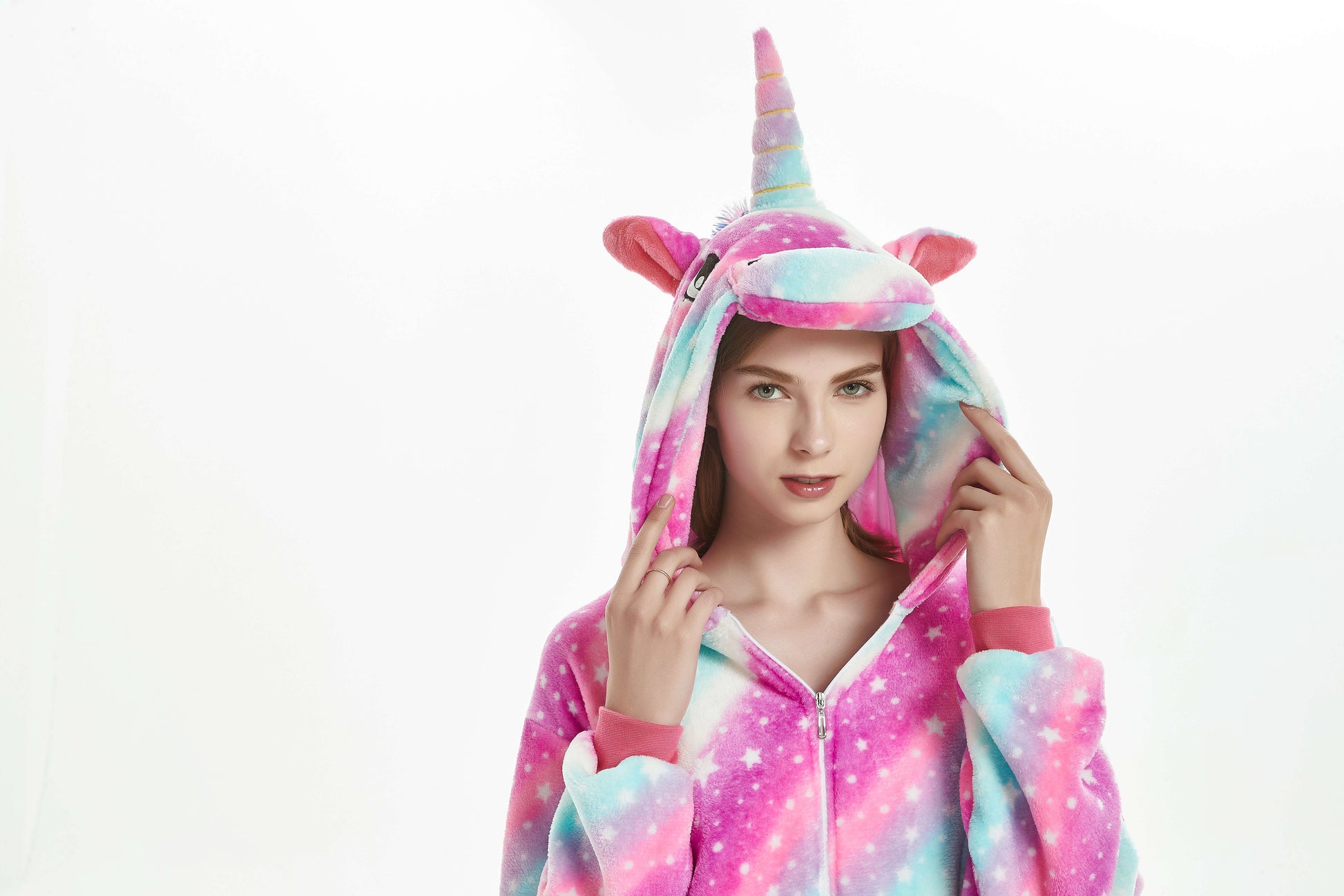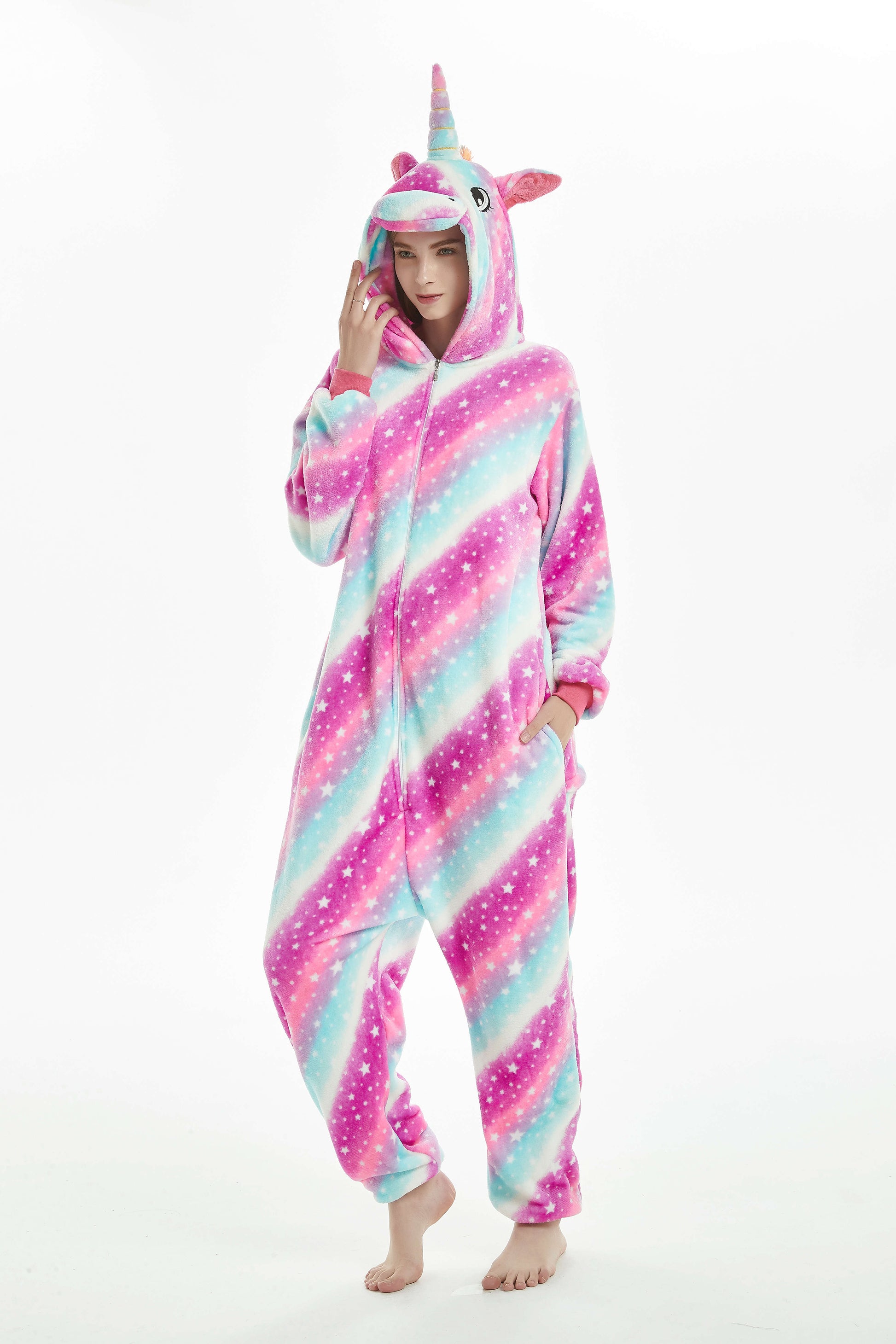 Pijama tip salopeta cu maneci lungi material flausat model unicorn gluga cu urechi inchidere cu fermoar in fata buzunare tivita cu banda elastica la incheieturi si glezne.