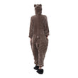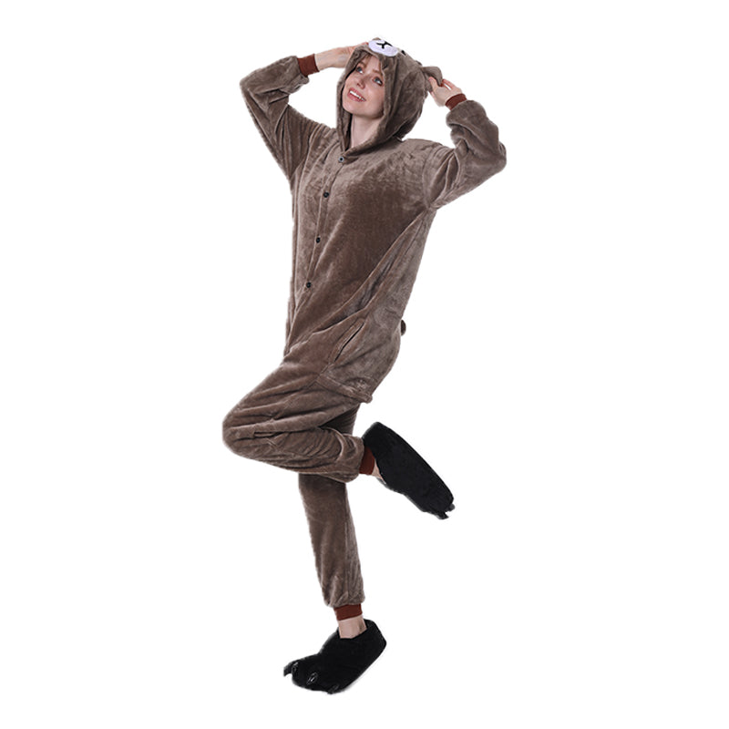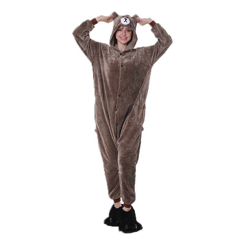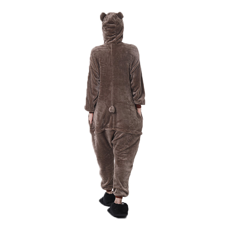 Pijama tip salopeta cu maneci lungi material flausat model ursulet gluga cu urechi inchidere cu nasturi in fata buzunare fermoar la spate coada atasata tivita cu banda elastica la incheieturi si glezne.