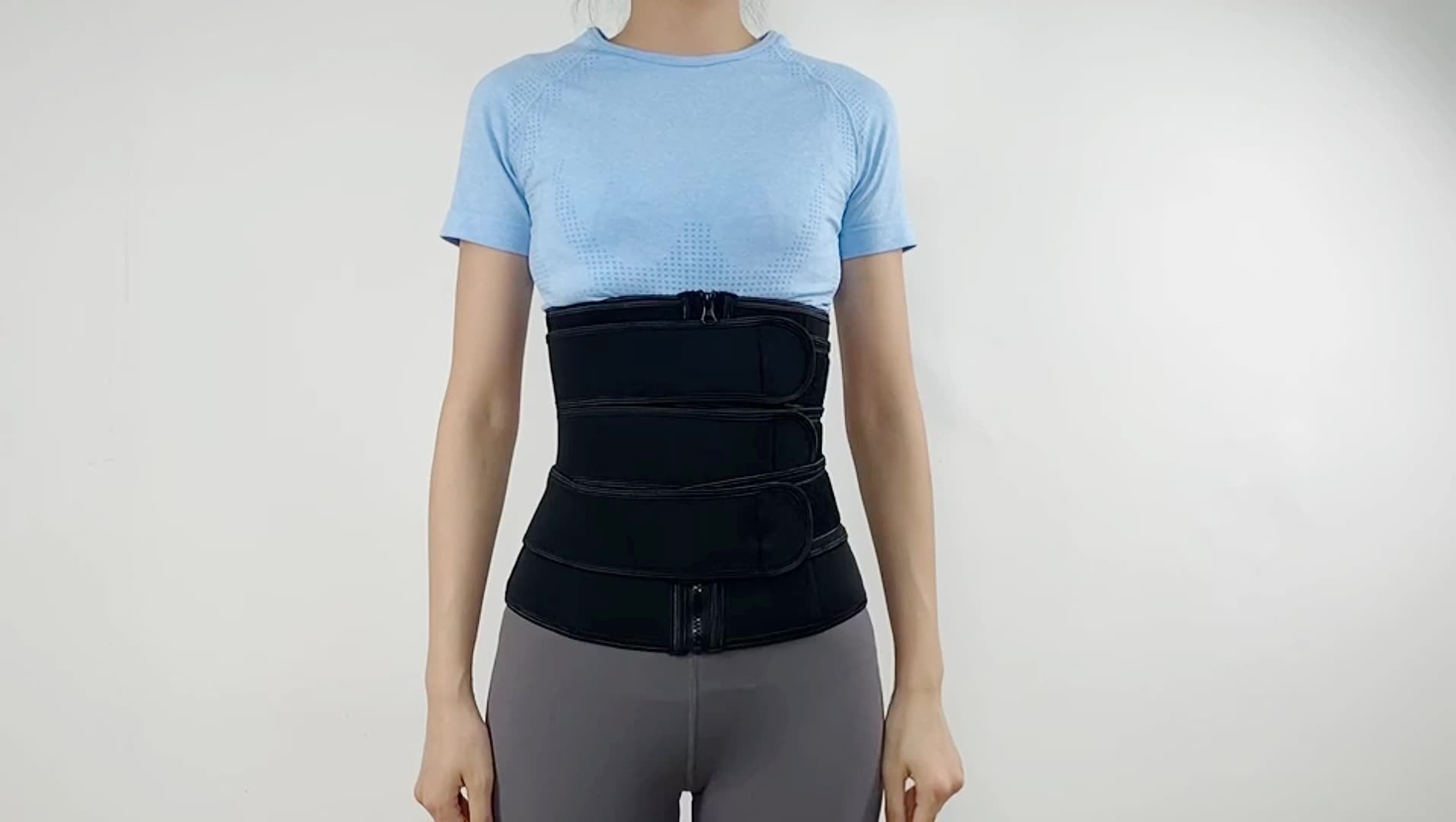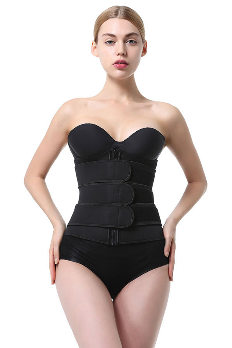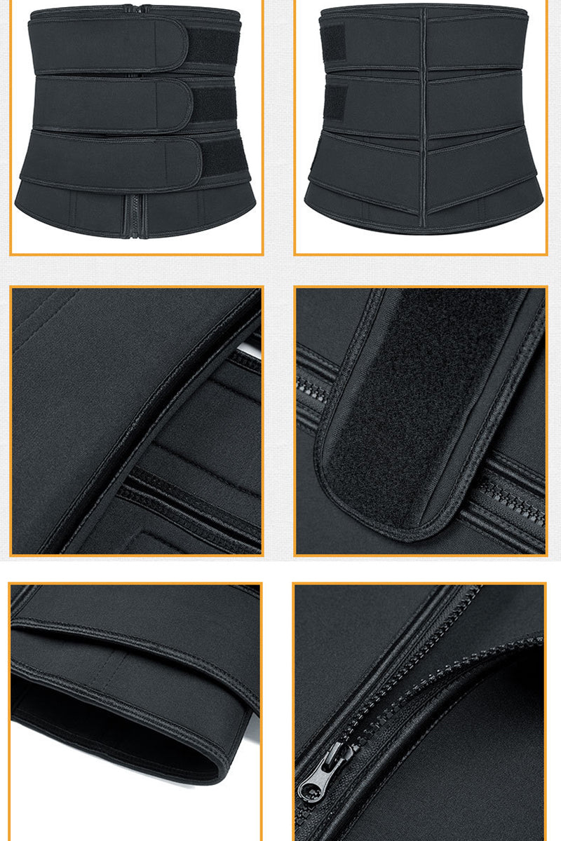 Corset modelator din neopren cu sistem dublu de inchidere pentru o buna sustinere a corpului. Are inchidere cu fermoar in fata si trei centuri orizontale late prevazute cu scai. Ideal pentru activitati fizice corectare postura sau pentru eliminarea cm in plus