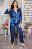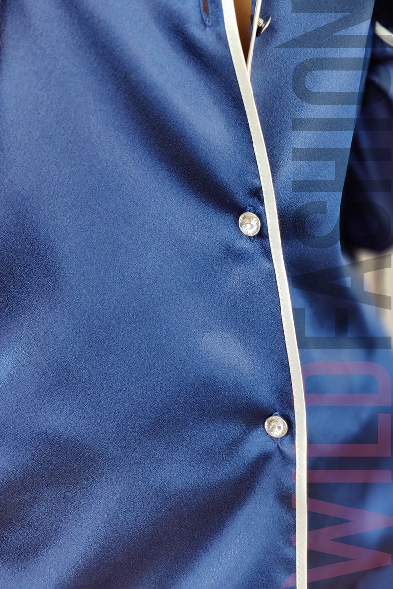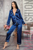 Pijama eleganta din material satinat alcatuita din: camasa eleganta din material fin la atingere maneci lungi si inchidere cu patru nasturi luciosi; pantaloni lungi cu elastic in talie