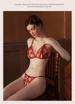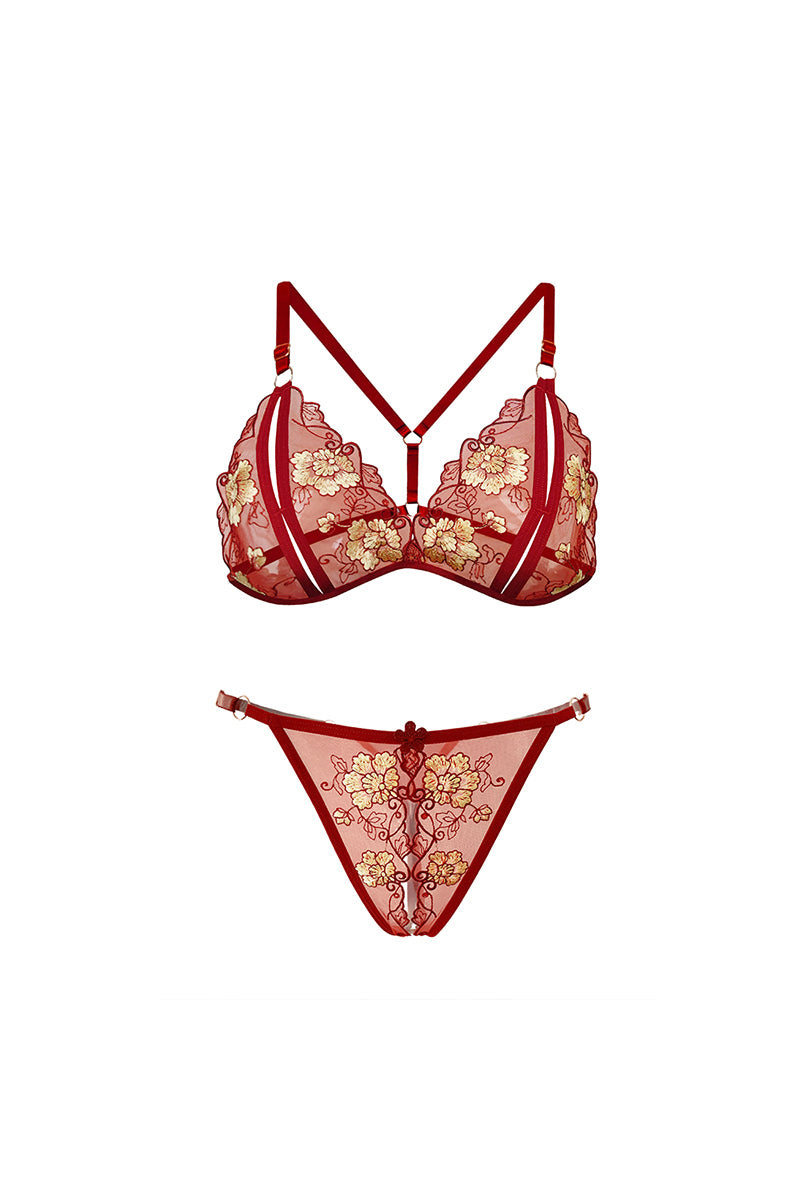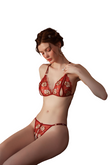 Set 3 piese lenjerie sexy cu broderie florala si margele, Rosu, GS1332-3