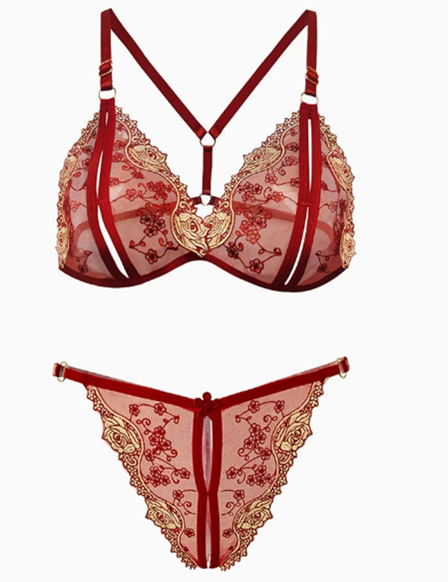 Set 2 piese lenjerie sexy cu broderie florala, visiniu cu broderie aurie, material plasa fina si elastan