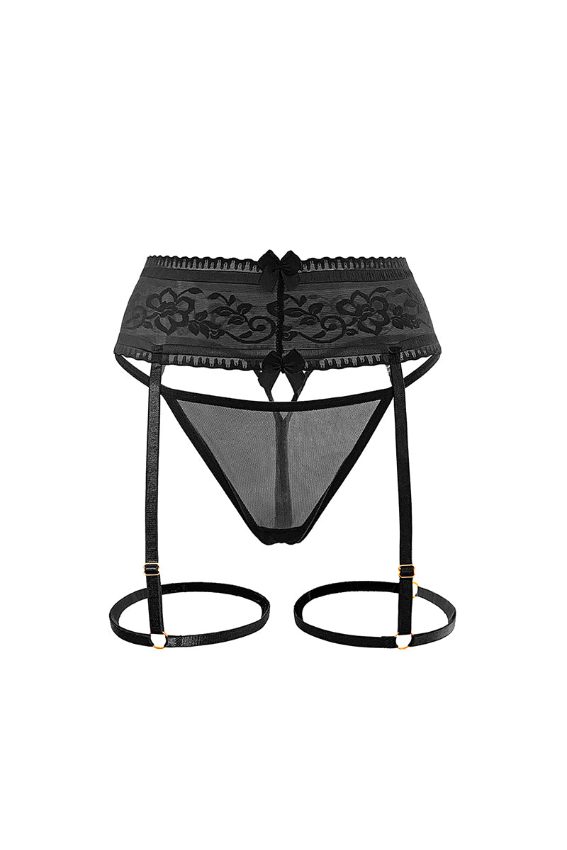 Chilot tanga sexy cu jartiere atașate și broderie aurie, Negru, GS1325-1