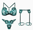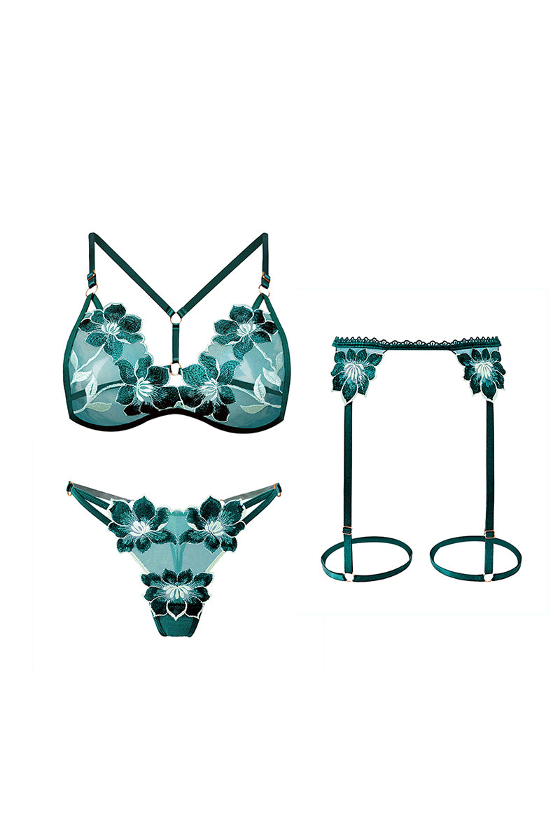 Set 3 piese lenjerie cu broderie florala, sutien, chilot tanga si portjartiera, Verde, GS1338-12