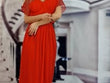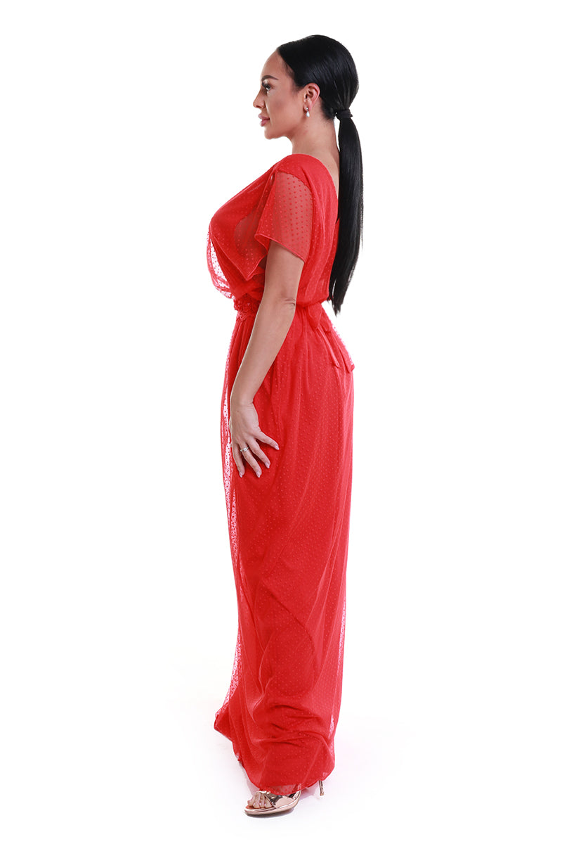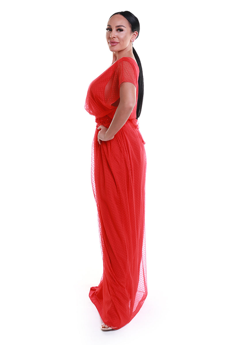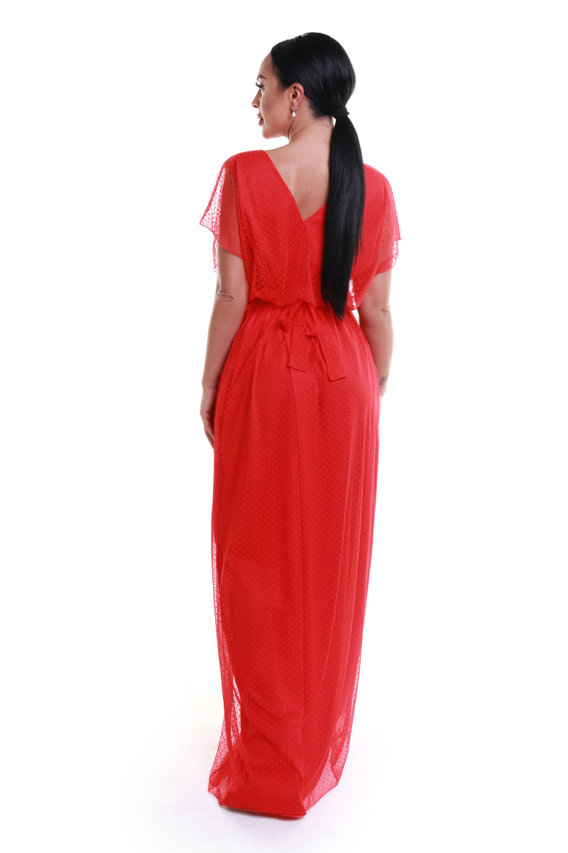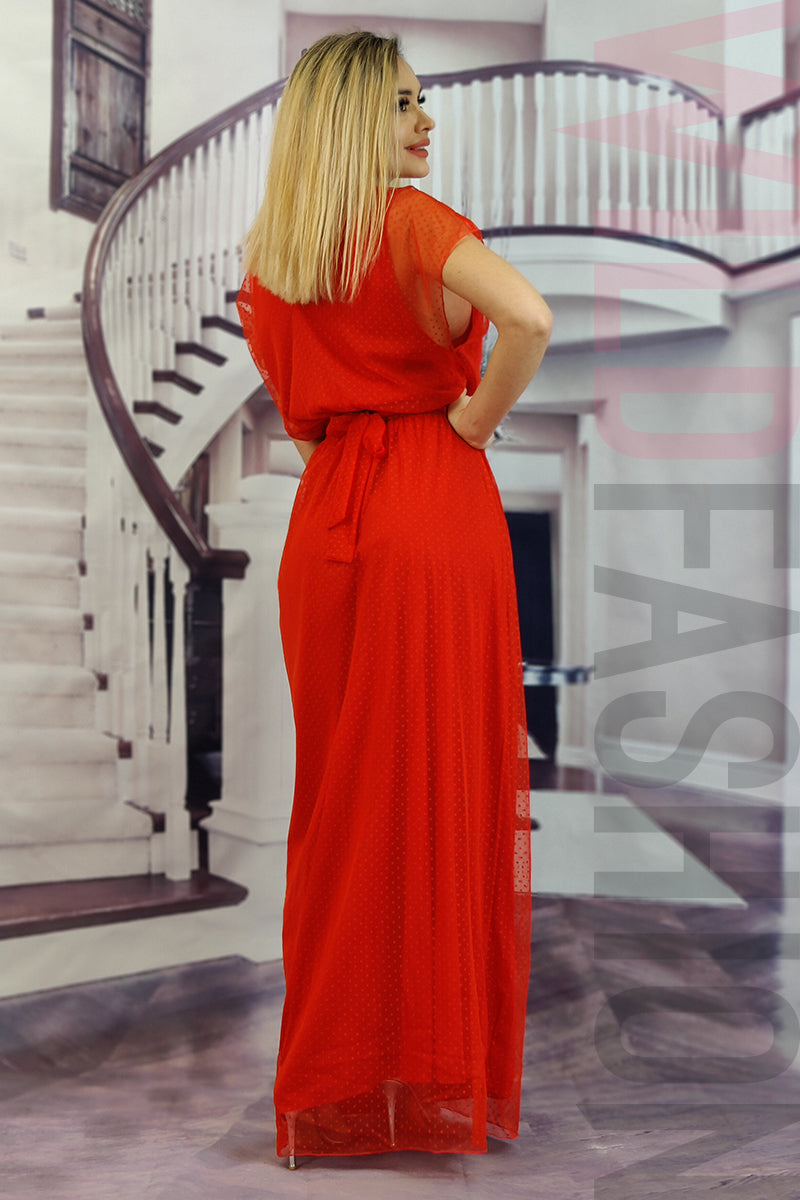 Rochie lunga de ocazie cu decolteu in V fata-spate. Este vaporoasa are captuseala iar in talie este accesorizata cu cordon.