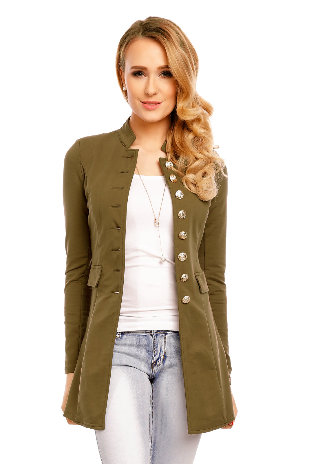 Jacheta tip sacou cu maneci lungi si buzunare. Sistemul de inchidere este cu nasturi in fata iar decolteul este reglabil.